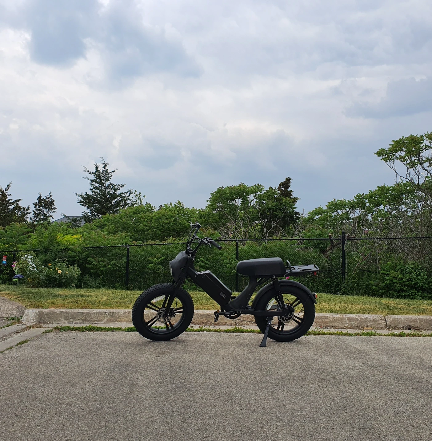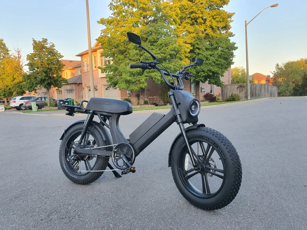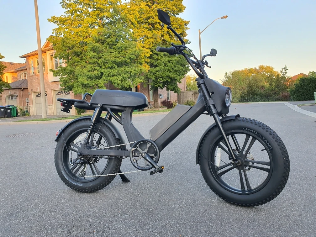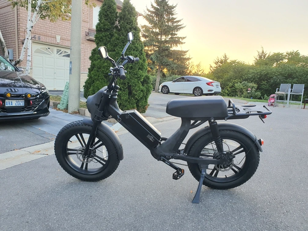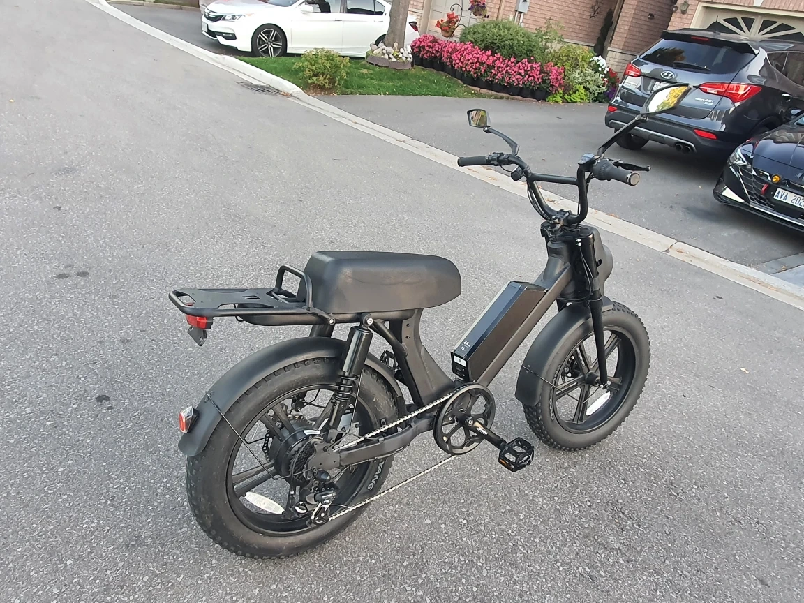 Selling a cool black electric moped-style bike! It's in great shape and ready for some fun rides around town. The fat tires give it a unique look and provide a smooth ride. It has a rack on the back for carrying items