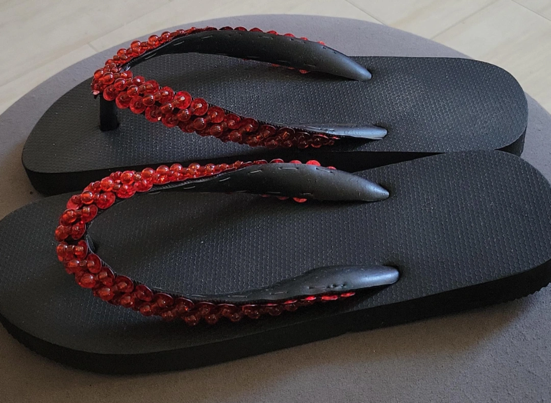 Selling a pair of new black flip flops. They have a cute beaded strap with red beads.