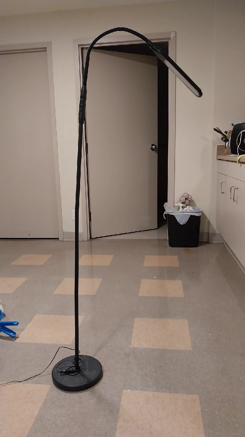 Selling a black floor lamp. It has a flexible neck so you can adjust the light where you need it. Great for reading or crafting!