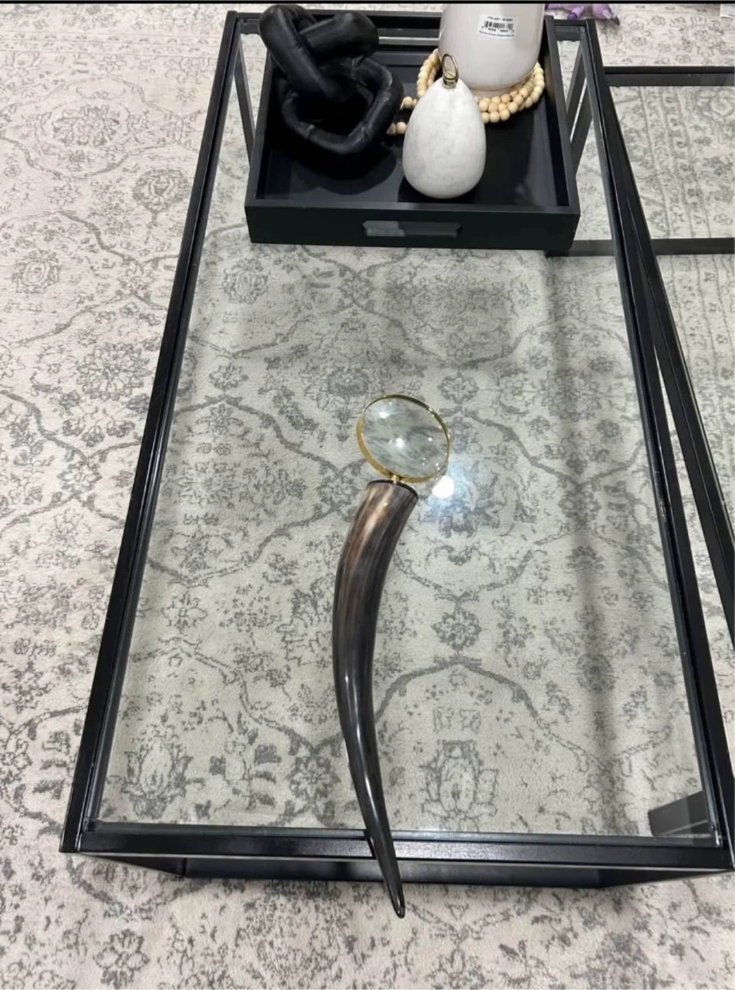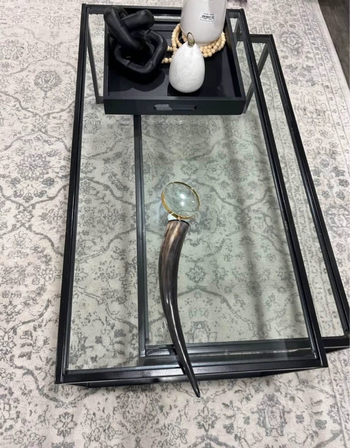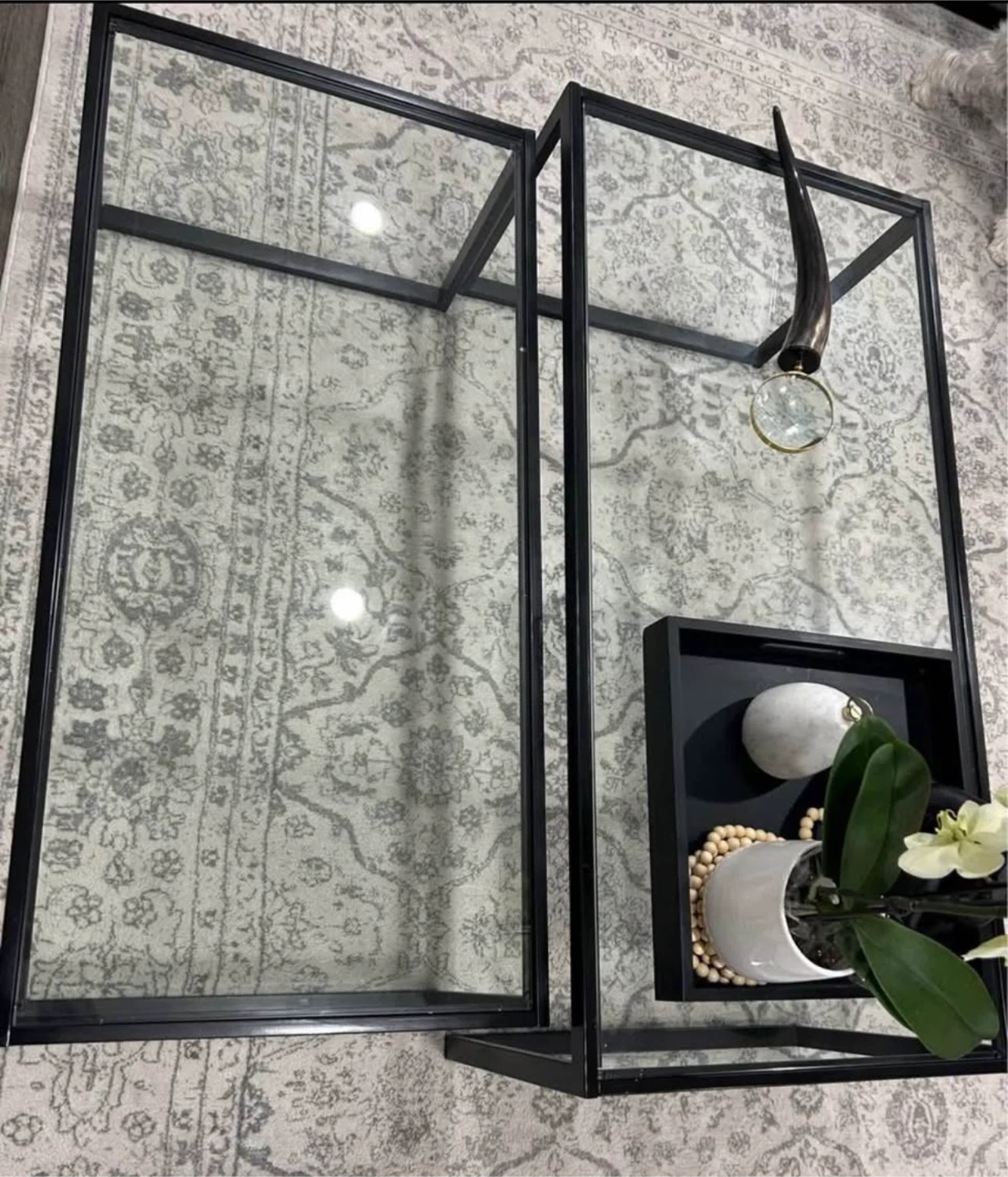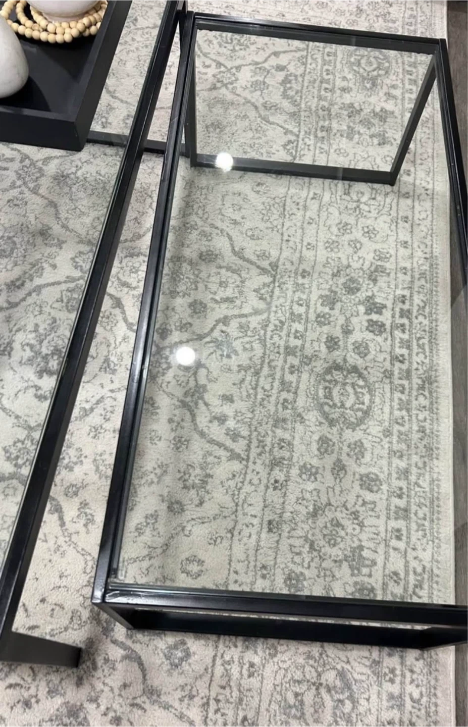 Selling a set of modern coffee tables featuring a sleek black frame and glass tops. These tables add a touch of contemporary style to any living space. They're in great shape and ready for a new home!
