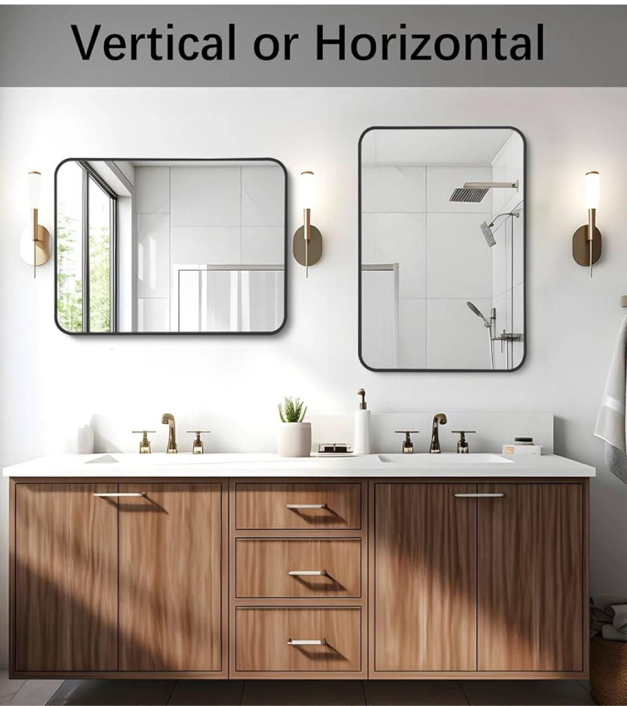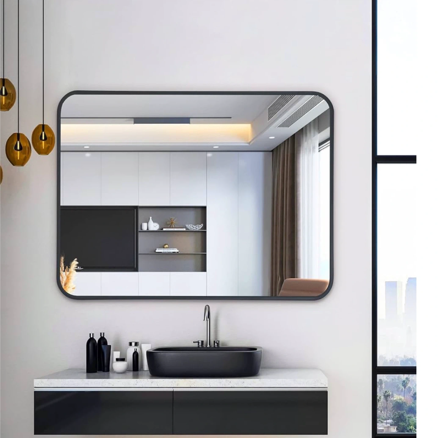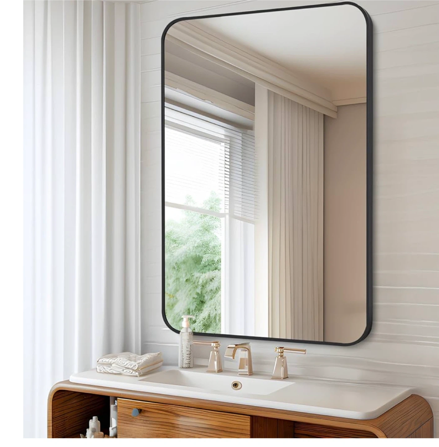 Selling a sleek rectangle mirror with a black frame! This mirror measures 24 inches by 36 inches, making it a great size for a bathroom or entryway. The rounded corner design adds a modern touch. It can be mounted either vertically or horizontally to suit your space