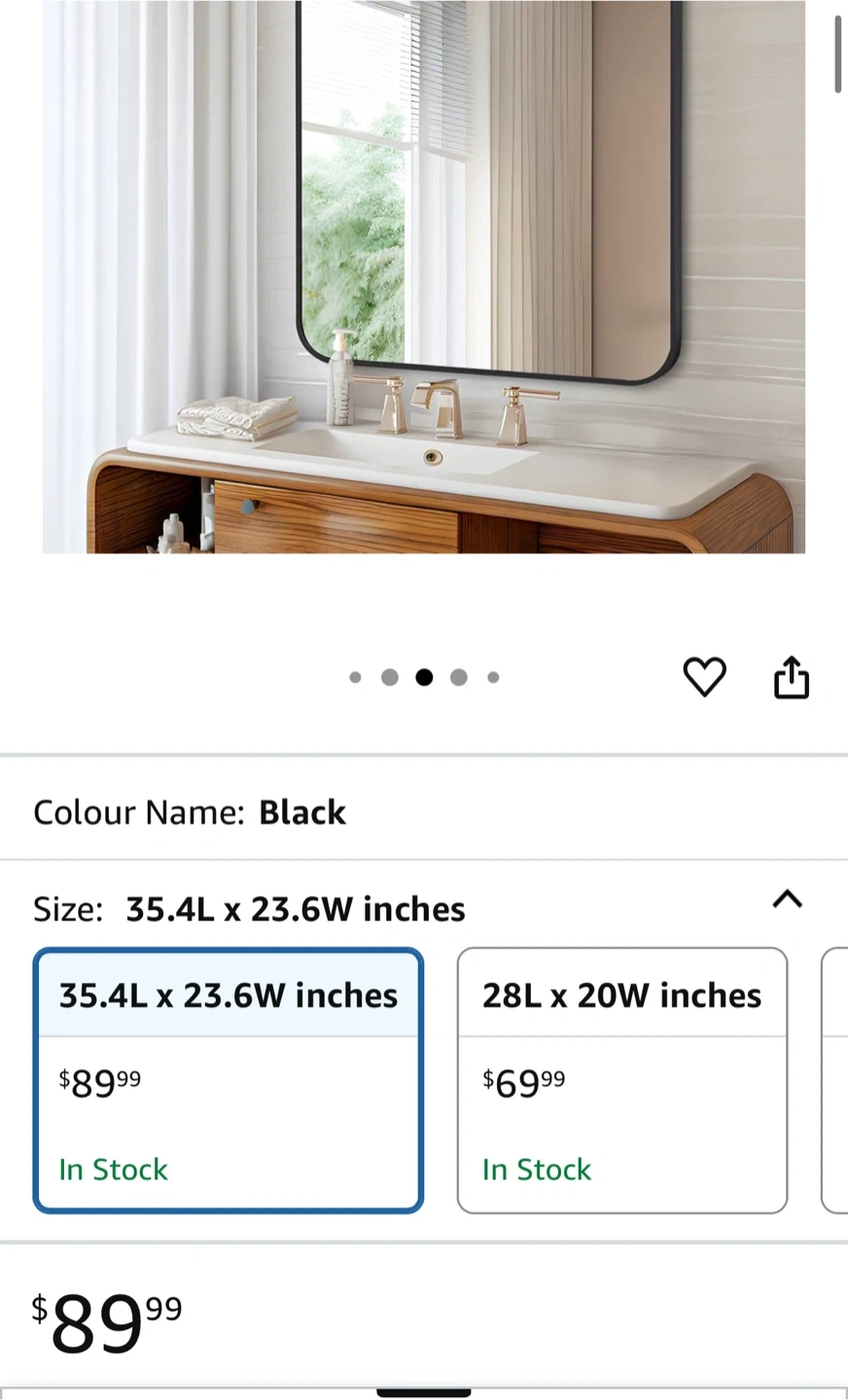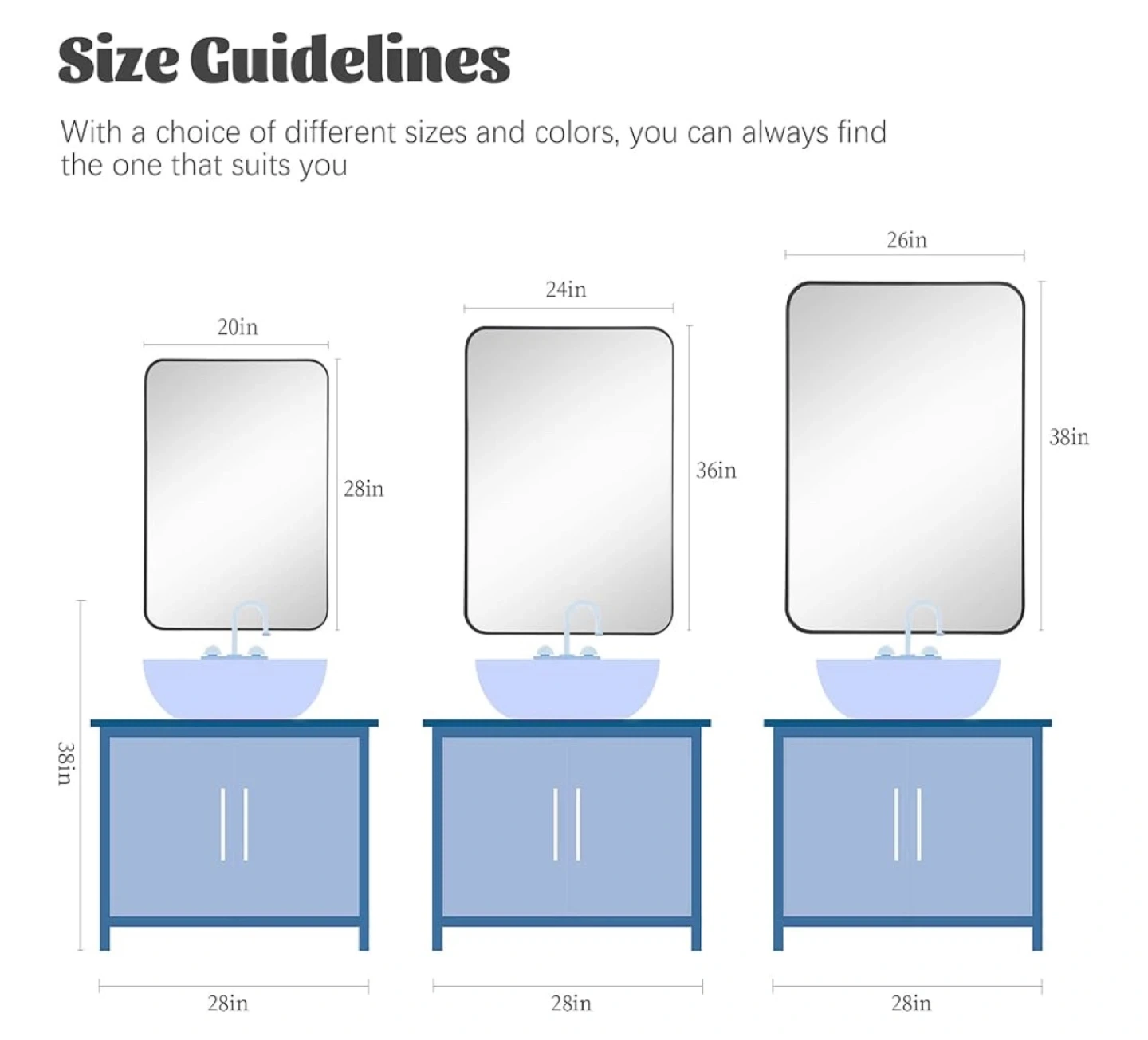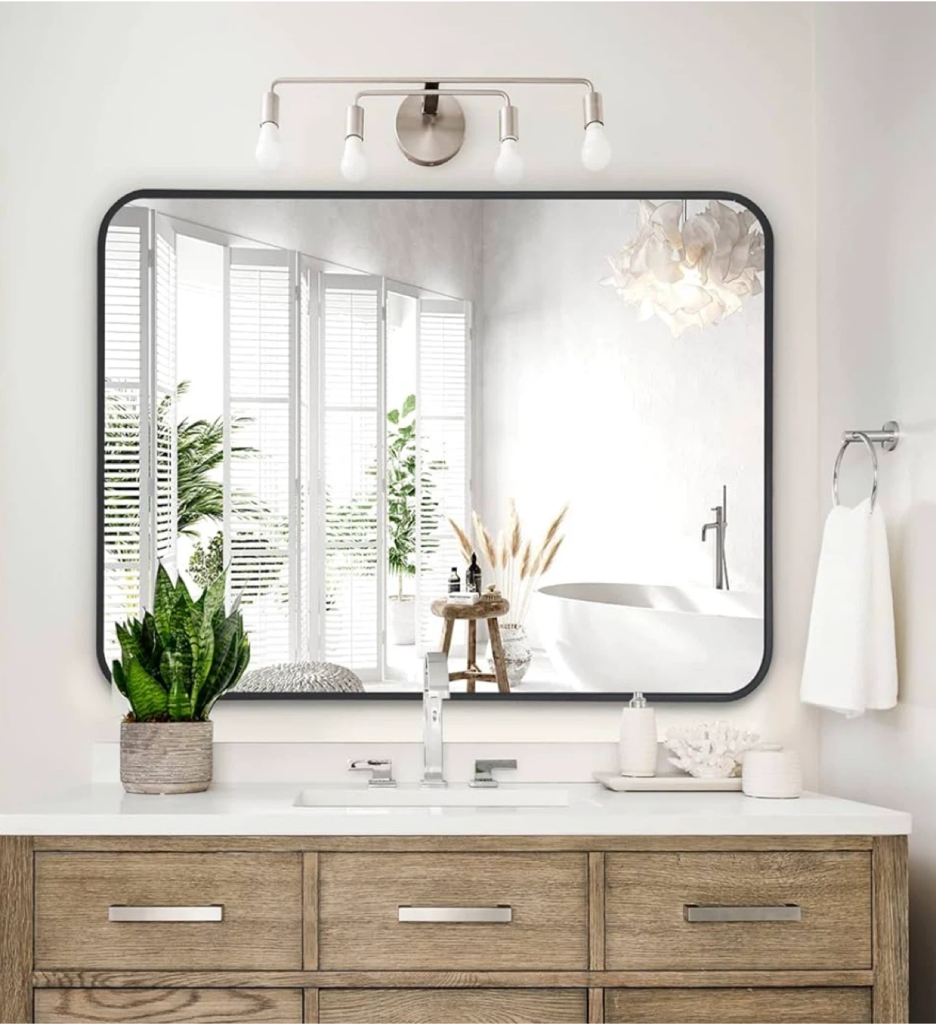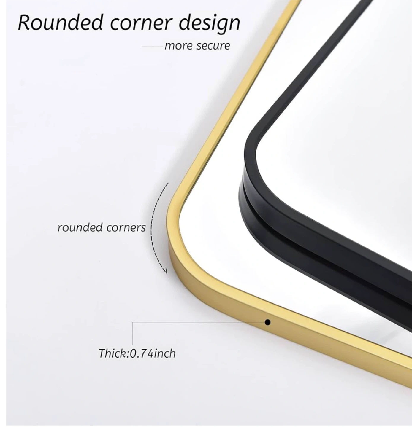 Selling a sleek rectangle mirror with a black frame! This mirror measures 24 inches by 36 inches, making it a great size for a bathroom or entryway. The rounded corner design adds a modern touch. It can be mounted either vertically or horizontally to suit your space