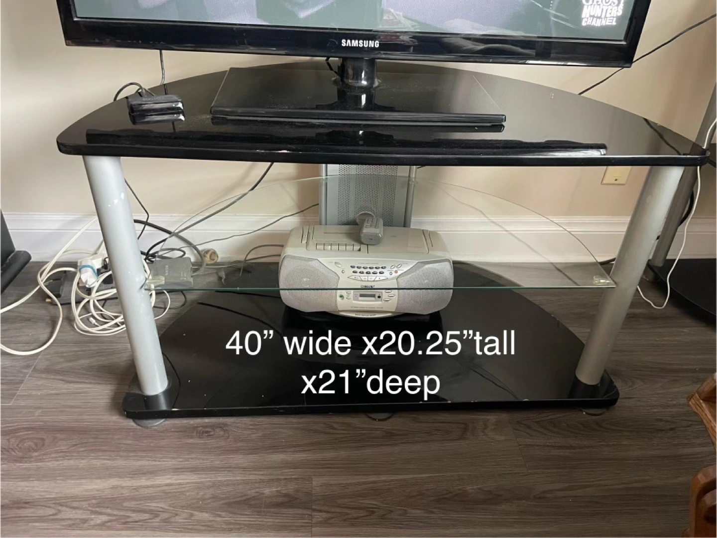 Selling a black glass TV stand! It's in great shape and ready for a new home. The dimensions are 40 inches wide, 20.25 inches tall, and 21 inches deep, so it's perfect for most TVs and media setups Asking $30.00 For pick up
