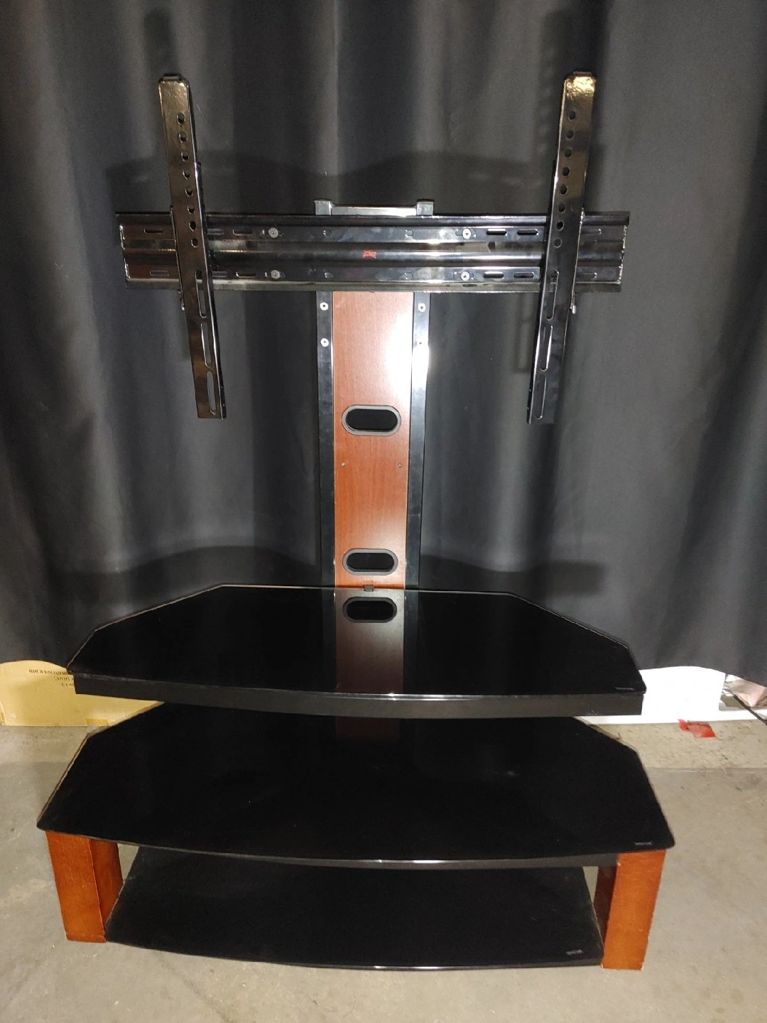 Selling a used TV stand with a built-in mount. It features a black glass top and bottom, with a wood-look centre support and a metal mounting bracket. Perfect for setting up your TV and media devices!