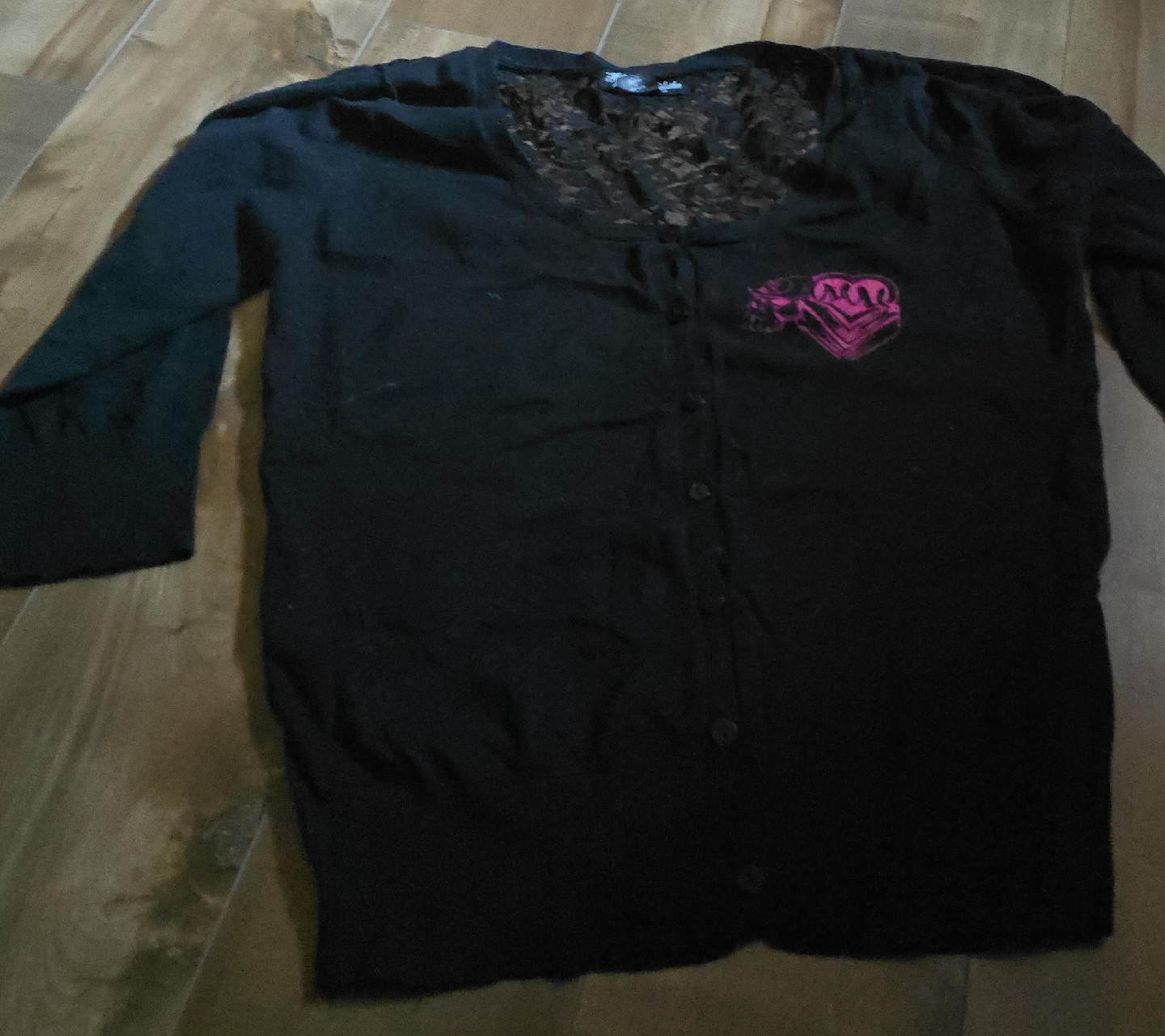 Selling a cute black cardigan with a heart design. It has a lace detail around the neckline and is in good condition. Perfect for layering!