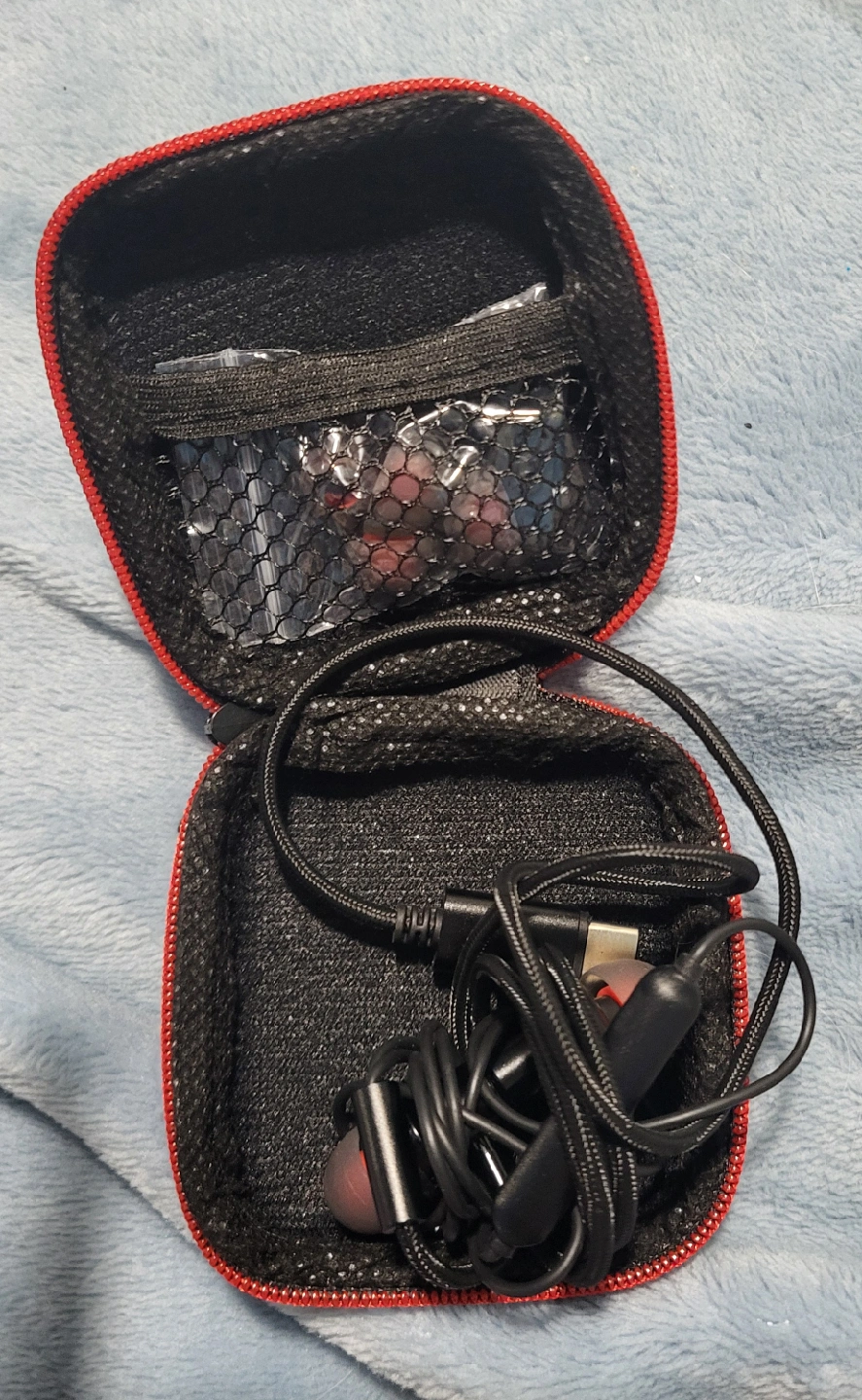 Selling a set of in-ear headphones that come with a carrying case. The case has a cool carbon fibre pattern on the outside and a soft lining inside to protect the headphones. Also included are a variety of earbud tips to ensure a comfortable fit