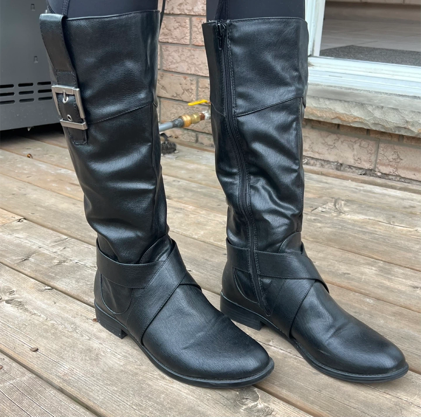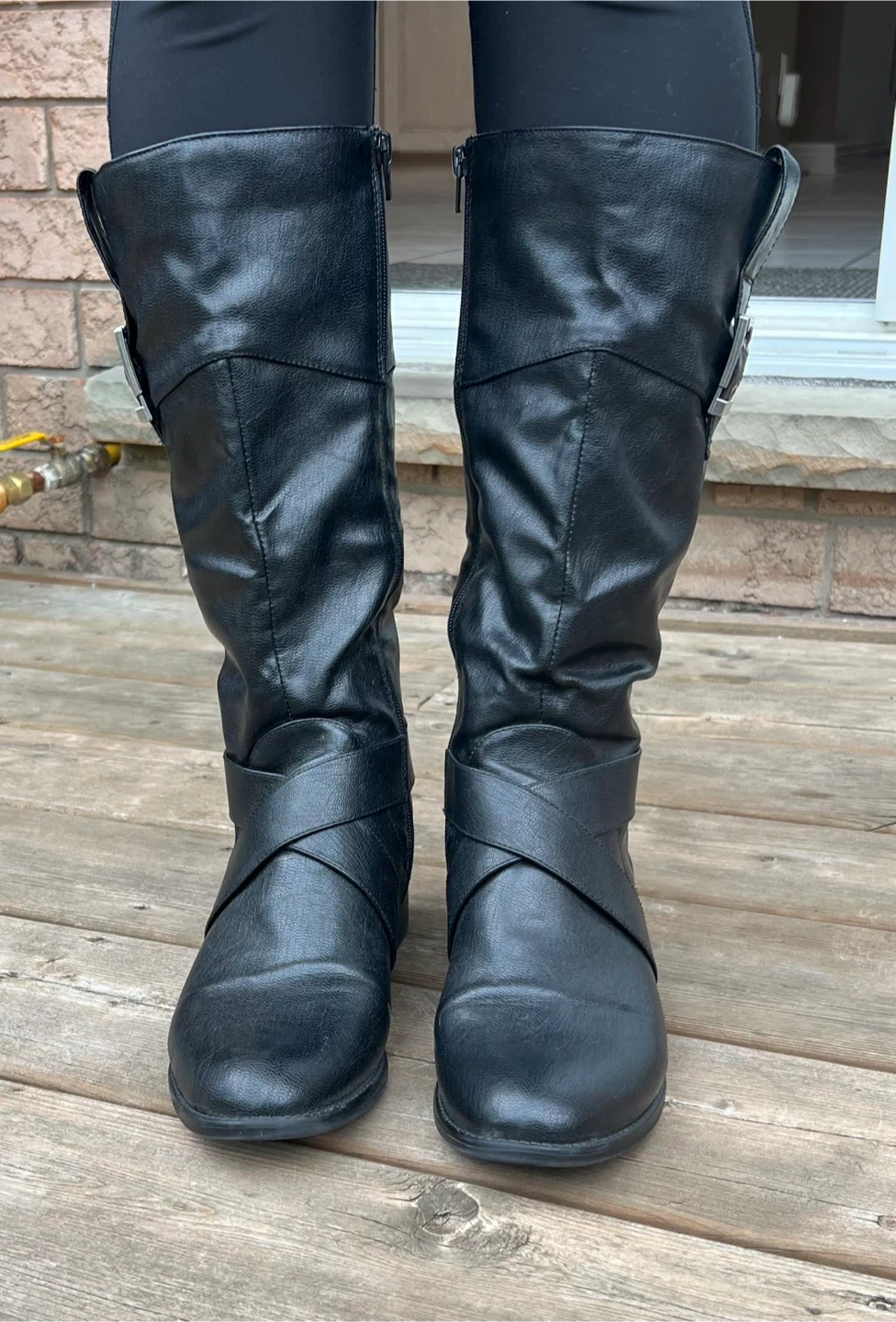 Selling a pair of black knee-high boots! They feature a stylish buckle detail and a comfortable fit. Perfect for adding a touch of chic to your wardrobe. Check them out!