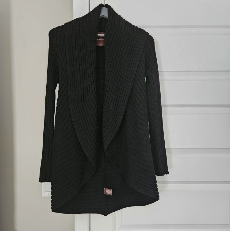 Selling a cozy black knit cardigan! It's perfect for layering and adding a touch of warmth to any outfit. The open-front design and soft knit material make it super comfy for everyday wear. It's in great condition and ready for a new home