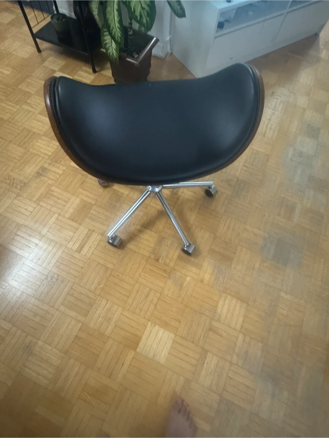 Selling a stylish black leather office chair. It's in great shape and ready to add some flair to your workspace. The chair features a sleek design with a comfortable black leather seat and a sturdy base. Perfect for your home office or study space