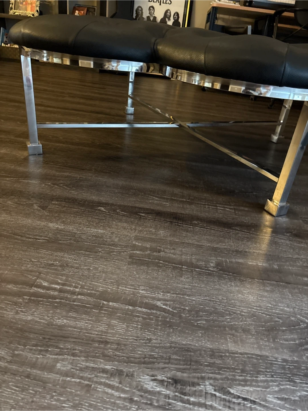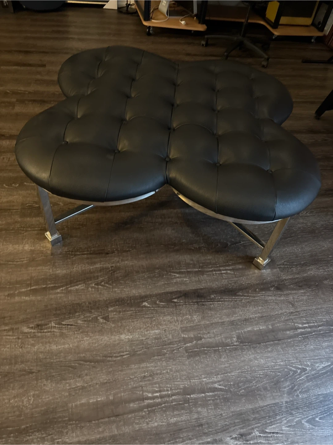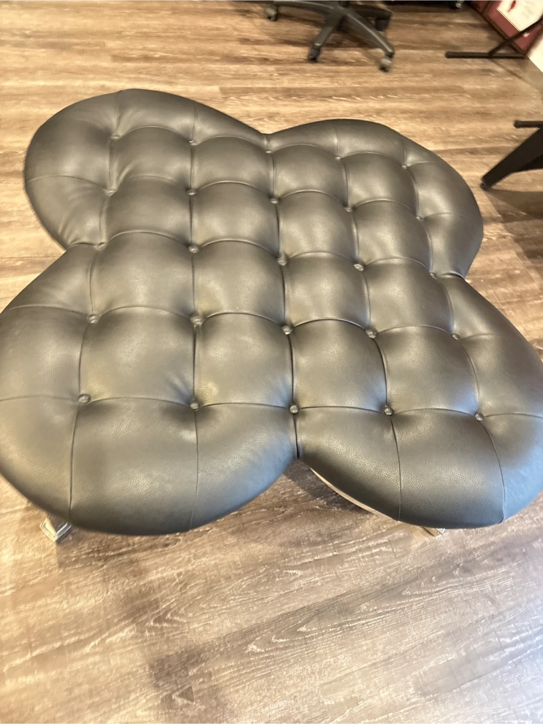 Selling a stylish black leather ottoman with a unique clover shape and chrome legs. It's in great condition and would look perfect in any living room or bedroom. The ottoman is comfortable and sturdy, perfect for resting your feet or using as extra seating. It's a great addition to any home!
