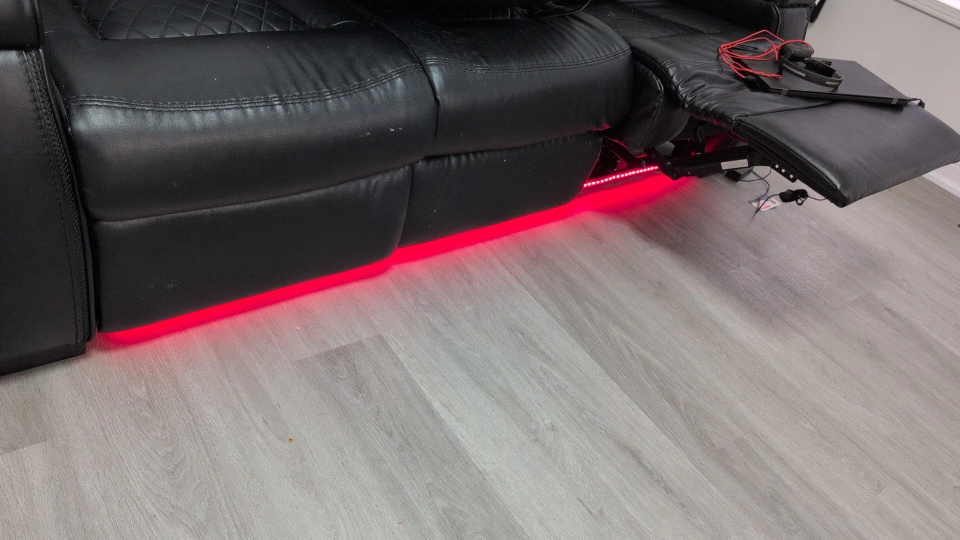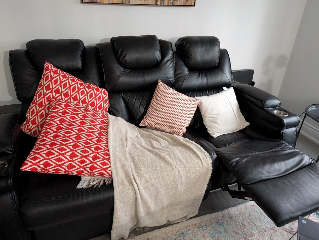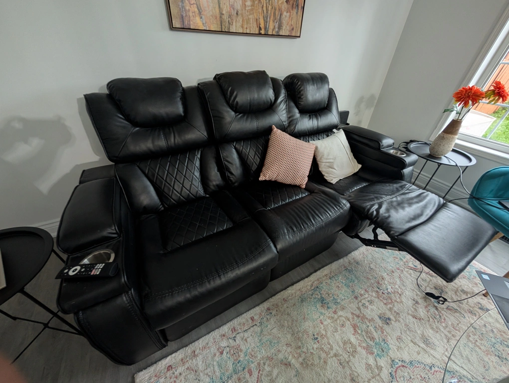 Selling a comfy black leather power reclining sofa! It features LED lighting for a cool vibe. Perfect for a home theatre or living room setup to relax and unwind after a long day