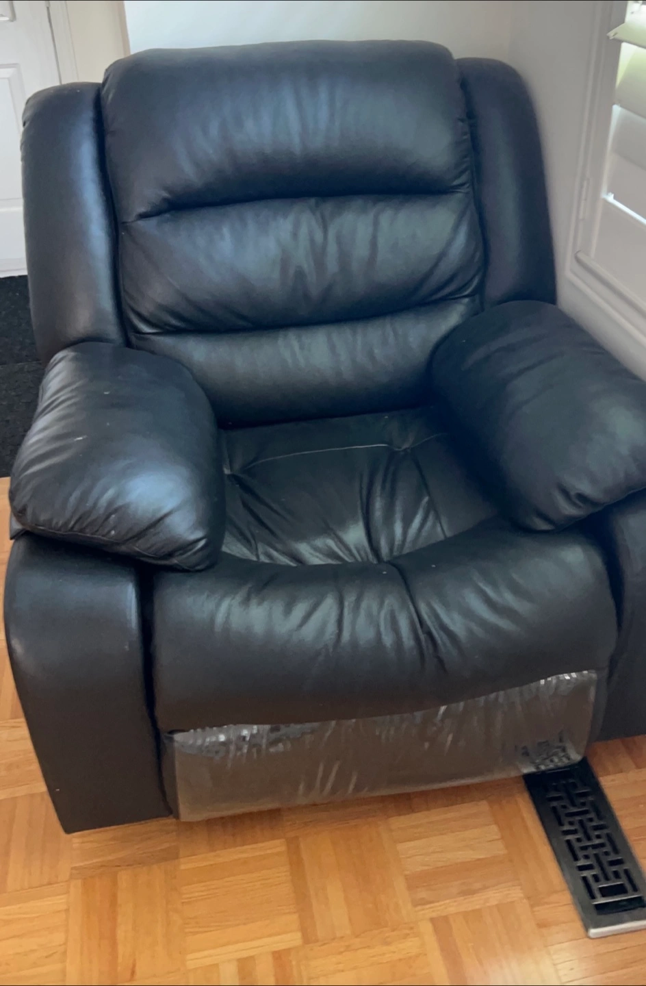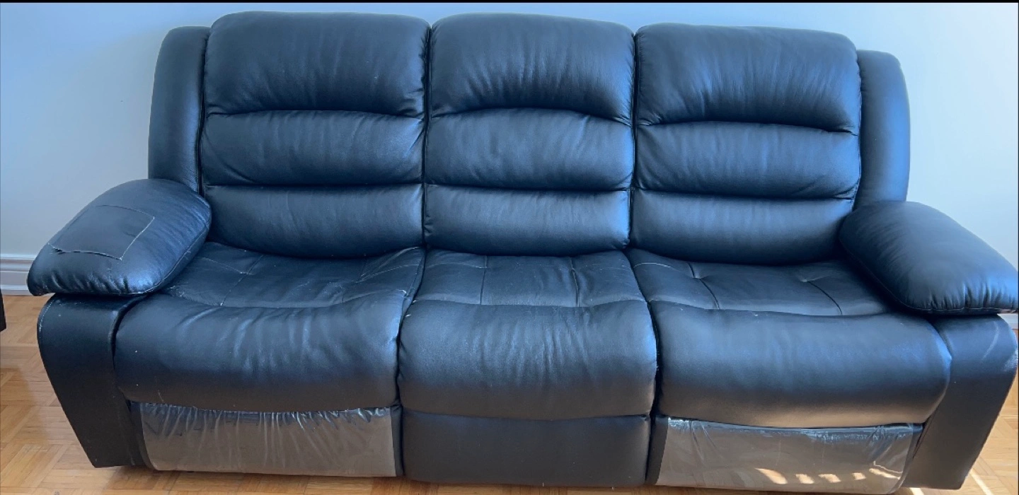 Selling a comfortable black leather reclining sofa set. It shows some signs of use, but it's still in good condition for relaxing and watching movies. The sofa features a reclining function for added comfort. If you're looking for a cozy addition to your living room, this could be it
