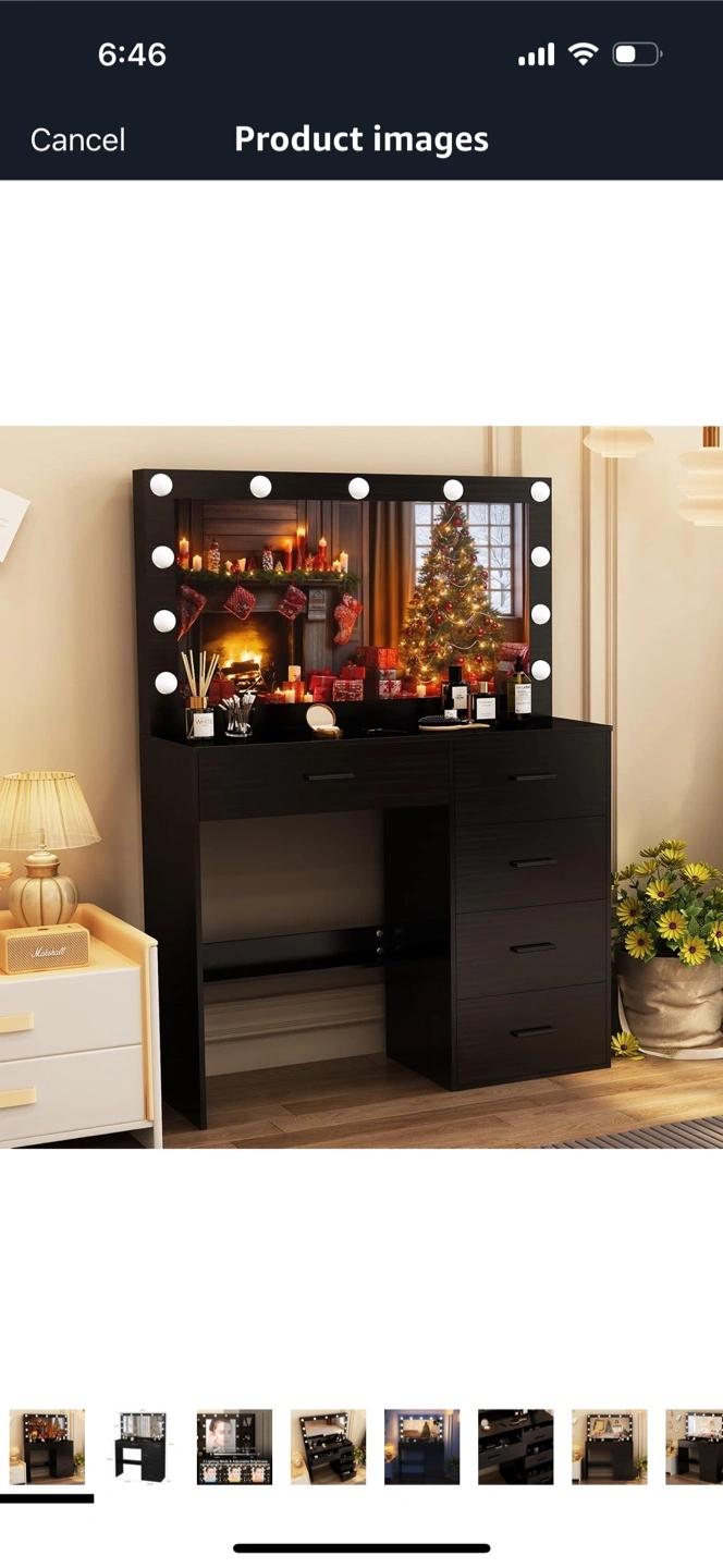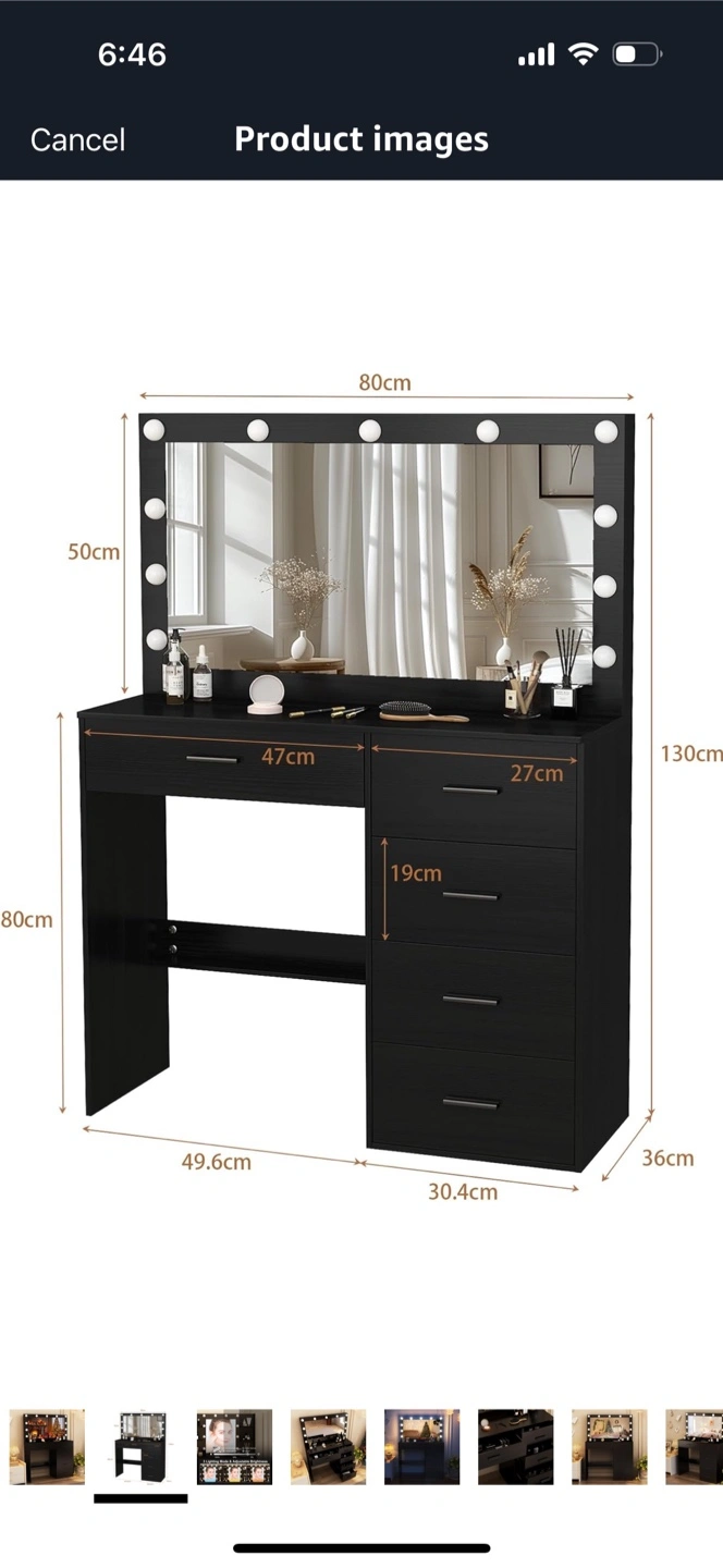 This is a black vanity makeup table that comes with a lighted mirror. It's perfect for getting ready in the morning or for a night out. The dimensions are approximately 80cm wide, 130cm high, and 36cm deep. It has drawers for storage and a comfortable space to sit while you do your makeup