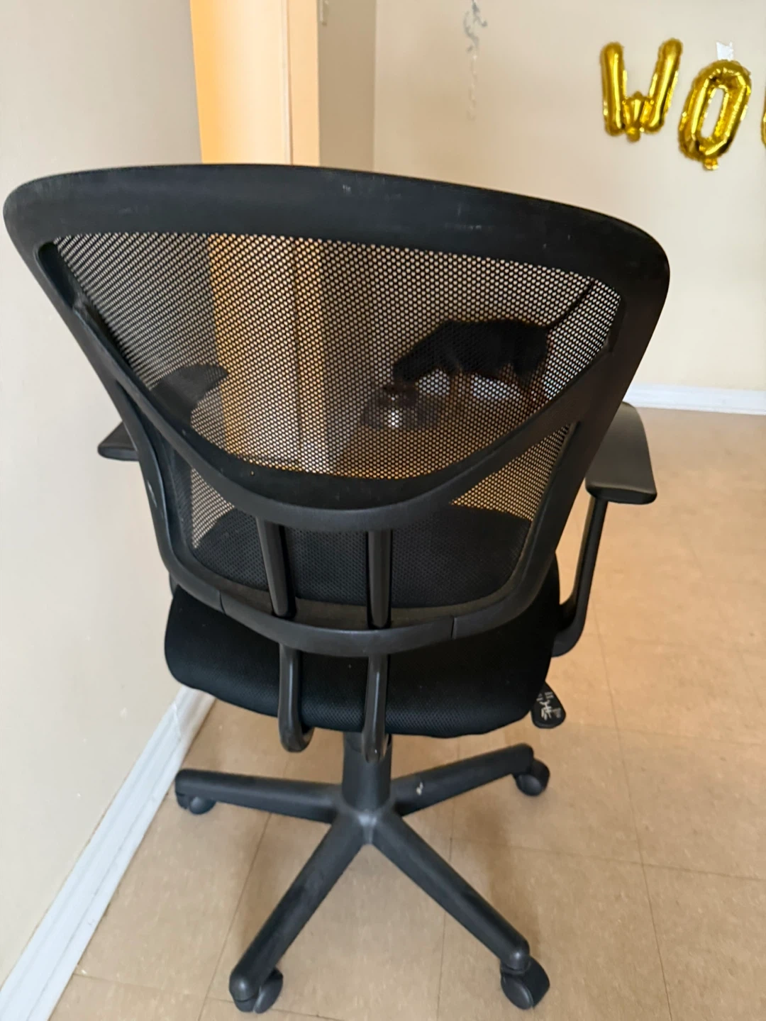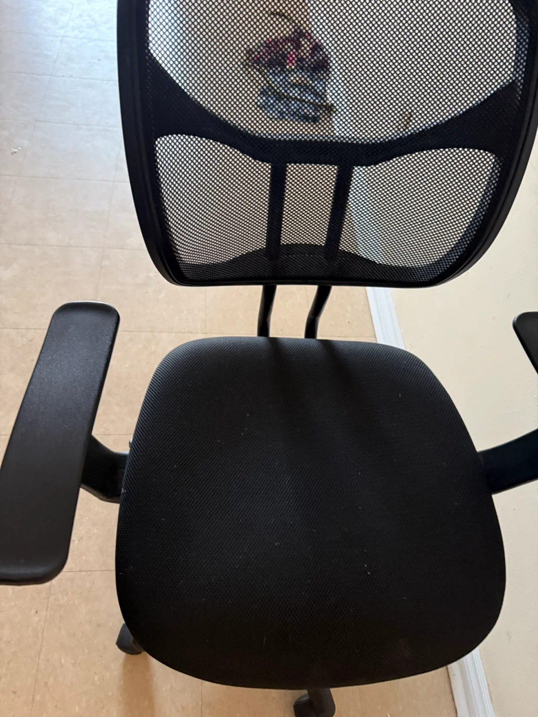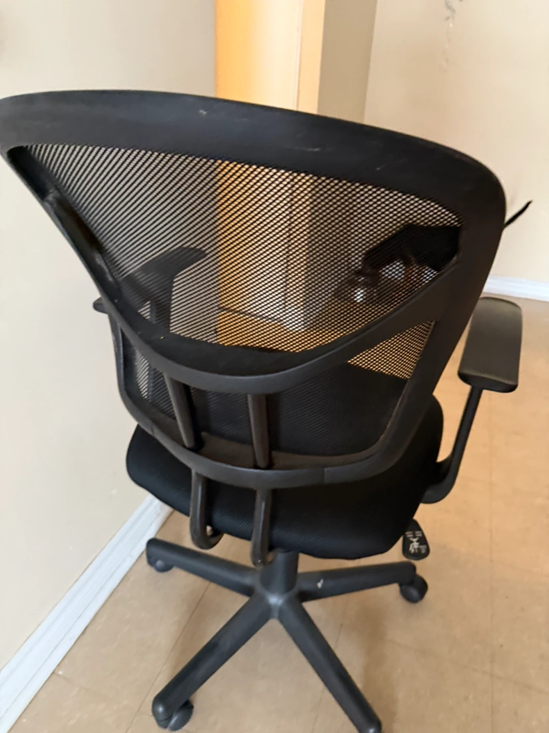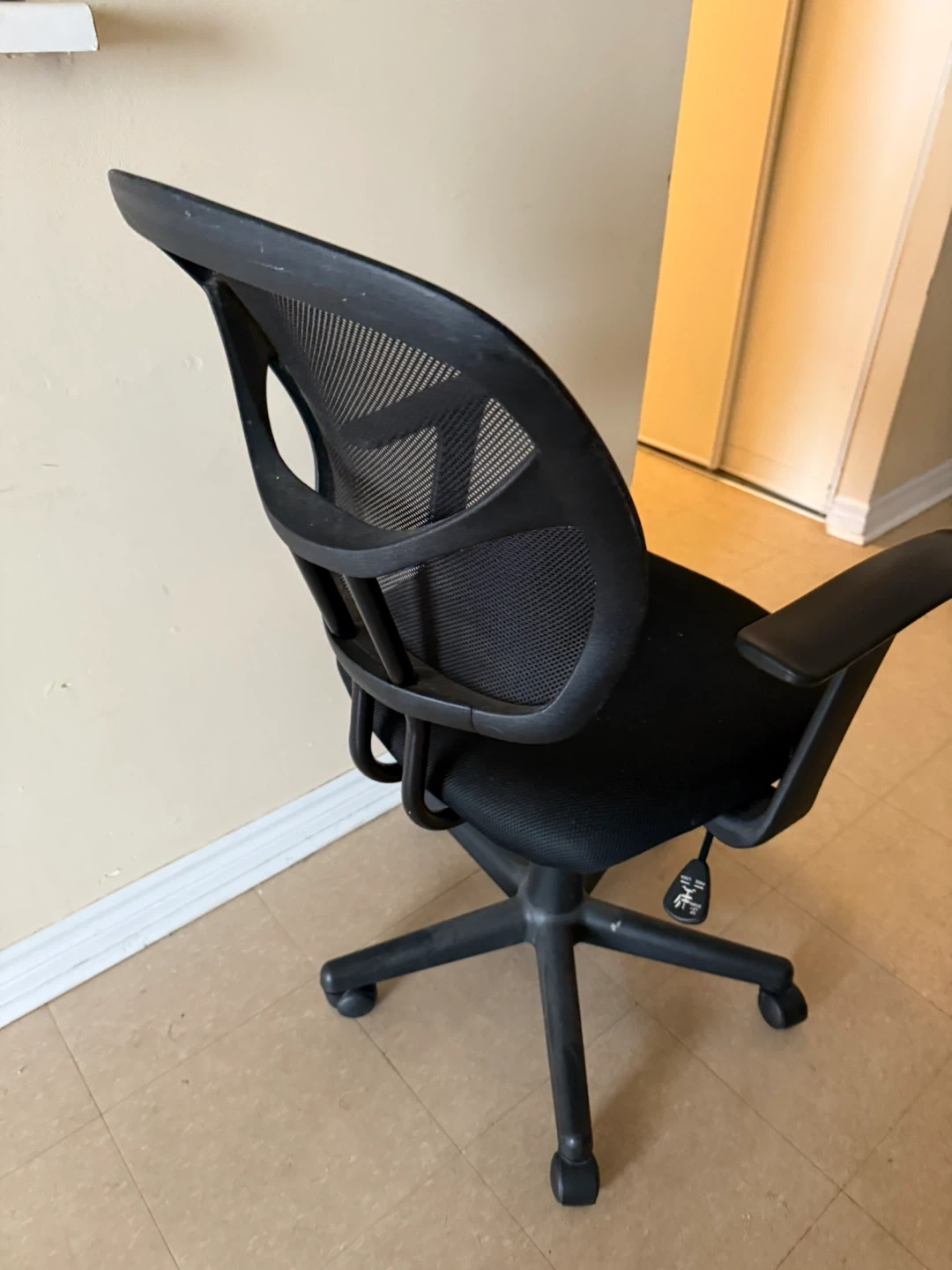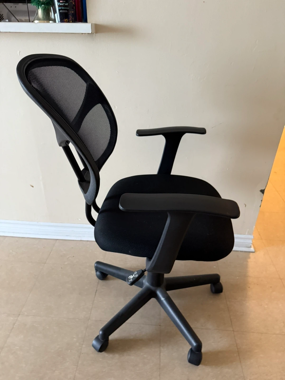 Selling a comfortable black mesh office chair. It's in great shape and ready to use in your home office or workspace. The mesh back provides good support and breathability, and the adjustable height ensures a good fit for different users. It's a practical and functional addition to any office setup!