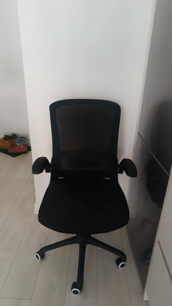 Ergonomic office chair. Black mesh back and fabric seat. Five rolling casters. Armrests included. Used condition.