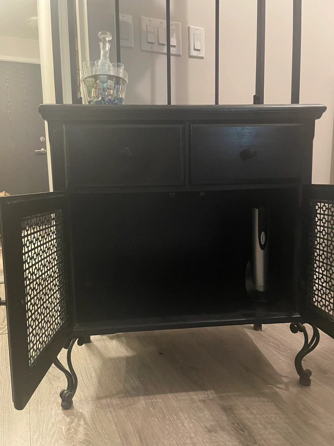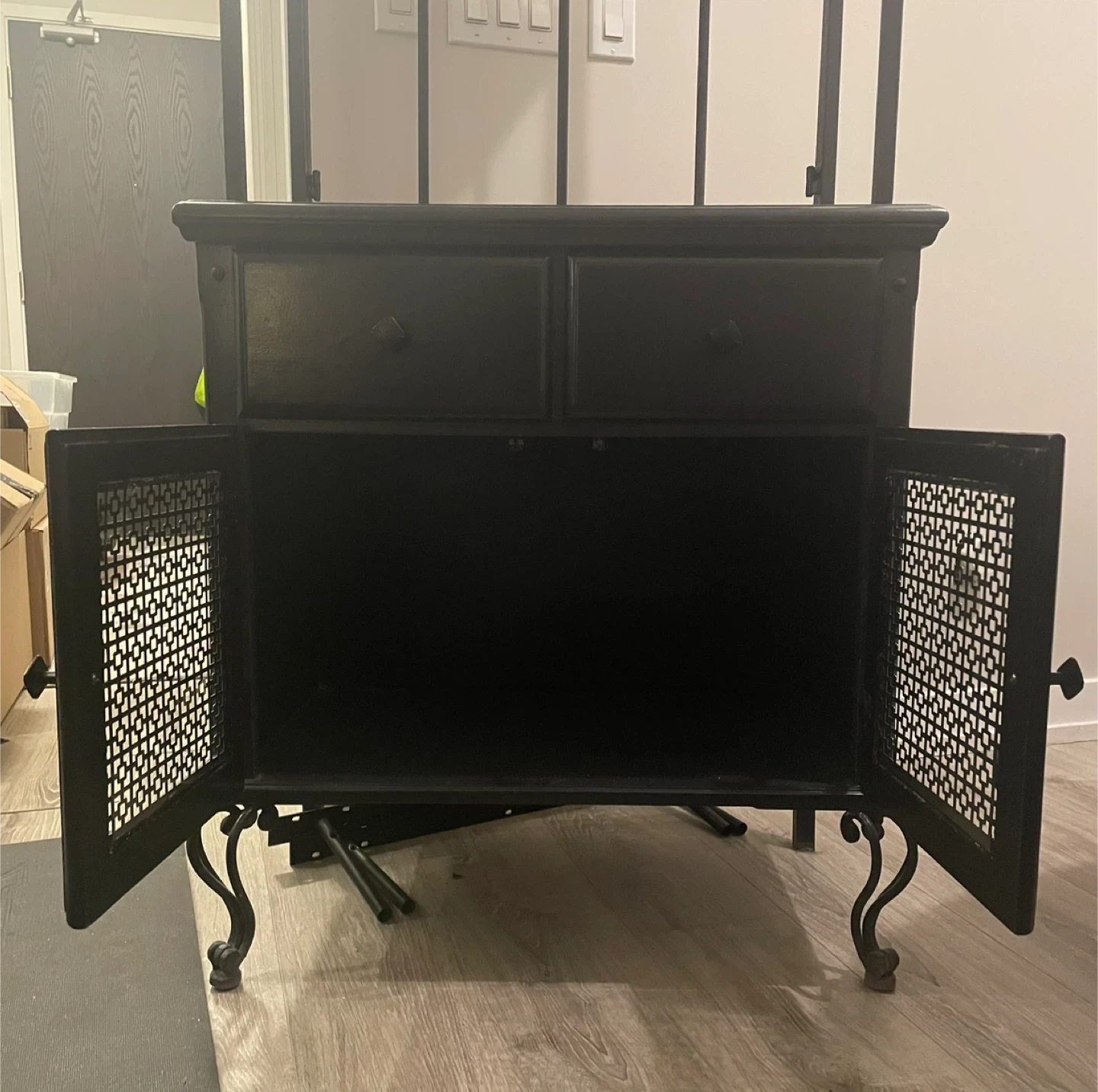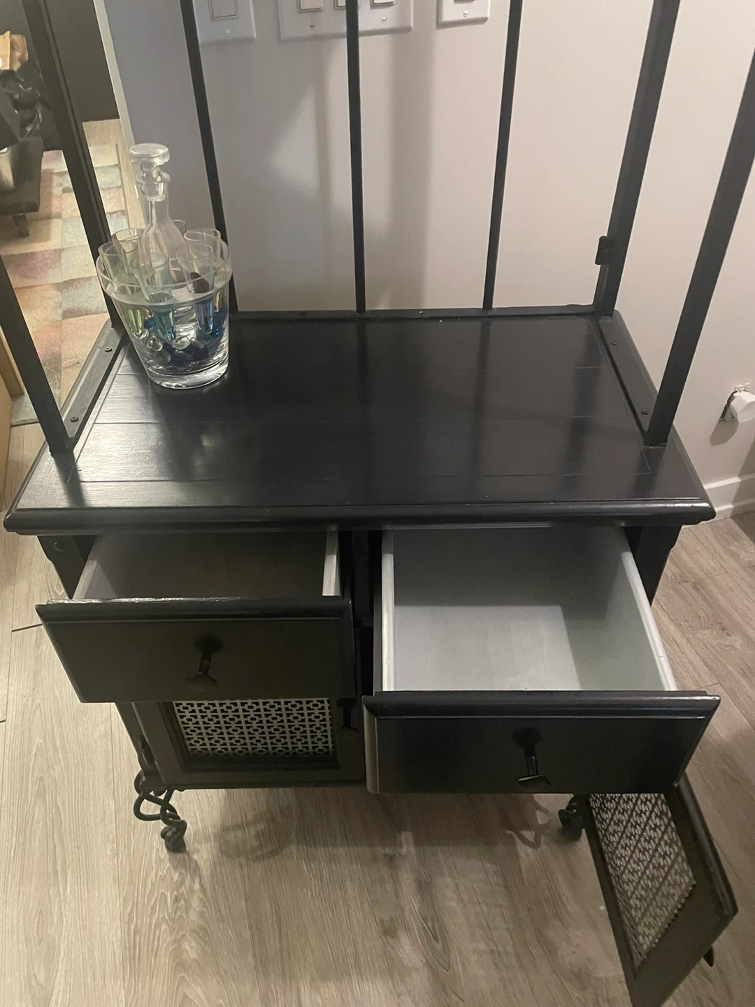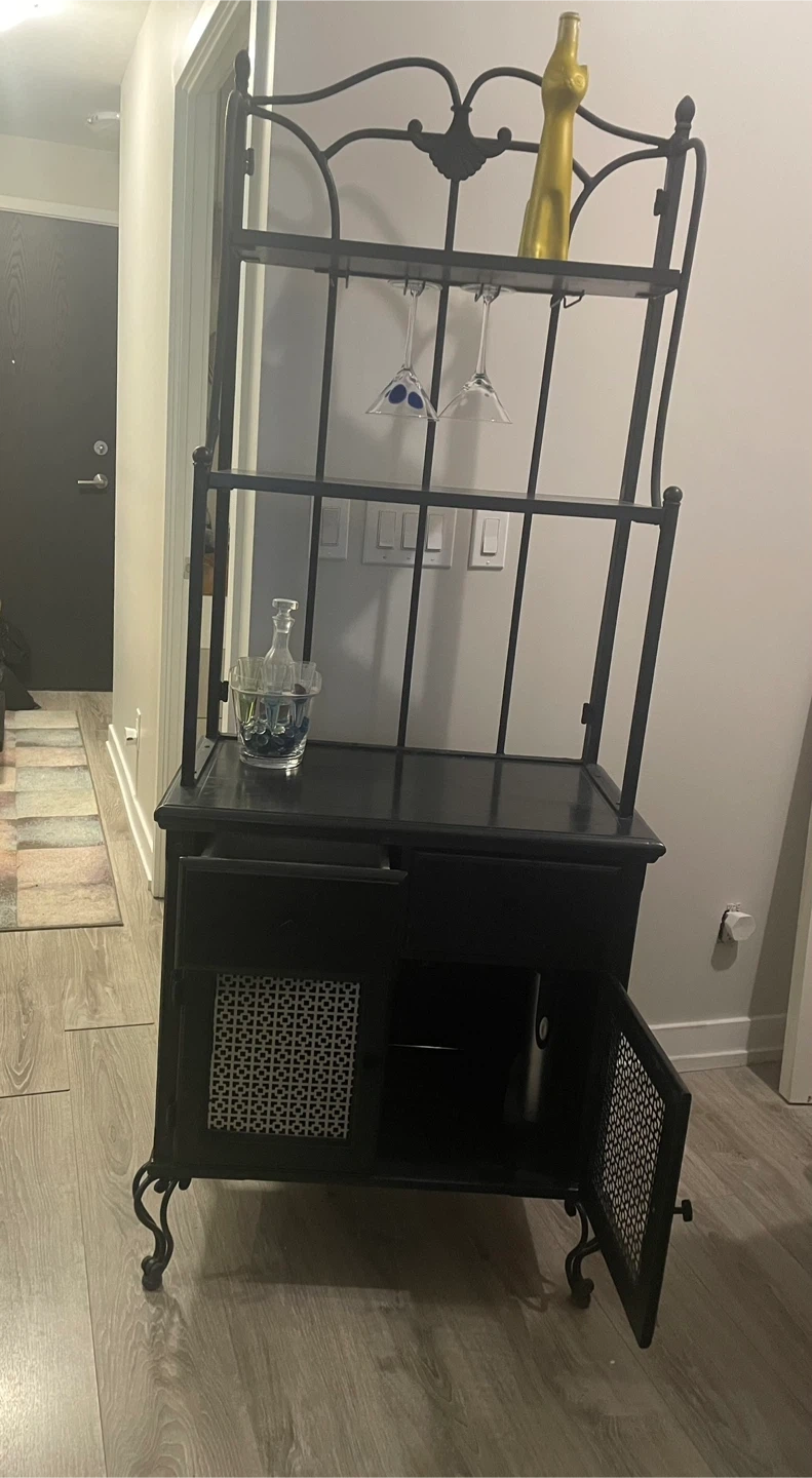 Mid century modern stylish black wood/wrought iron bar cabinet with a built-in wine rack! It's perfect for storing your favourite drinks and glassware. The cabinet features drawers and doors for extra storage. Great for any home bar or dining area