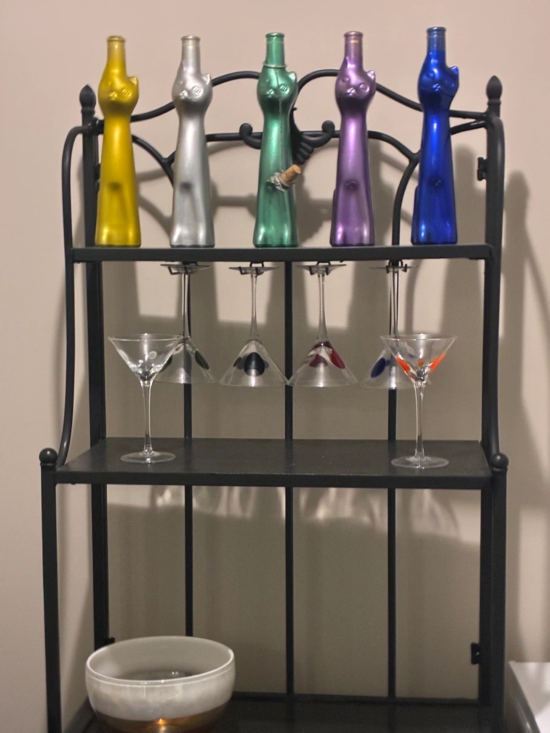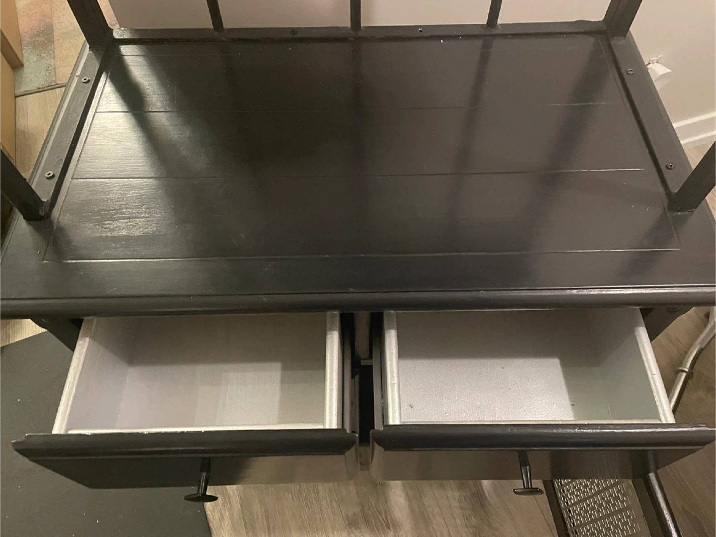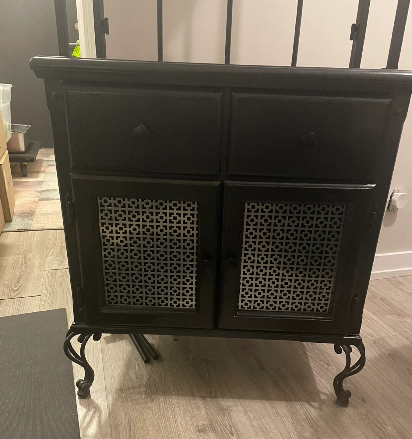 Mid century modern stylish black wood/wrought iron bar cabinet with a built-in wine rack! It's perfect for storing your favourite drinks and glassware. The cabinet features drawers and doors for extra storage. Great for any home bar or dining area