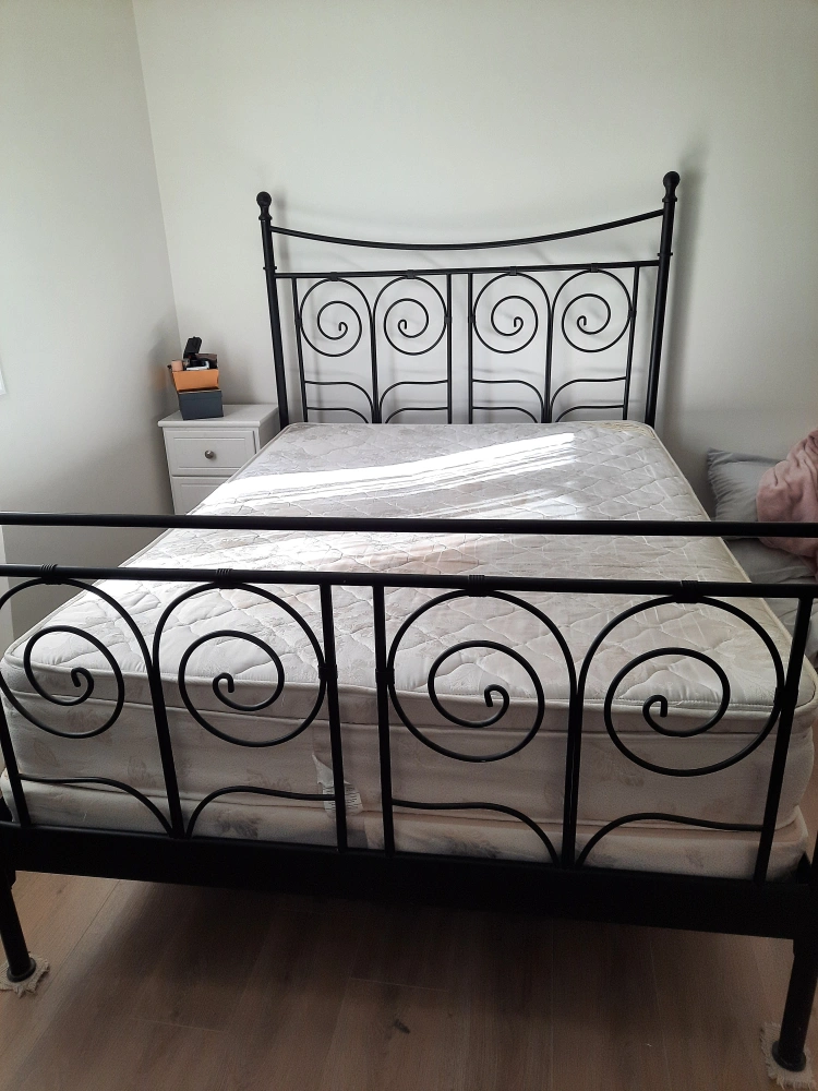 Selling a queen-size bed frame. It's a black metal frame with a decorative, swirly design on the headboard and footboard. It's in good condition and ready for a new home! (no mattress)