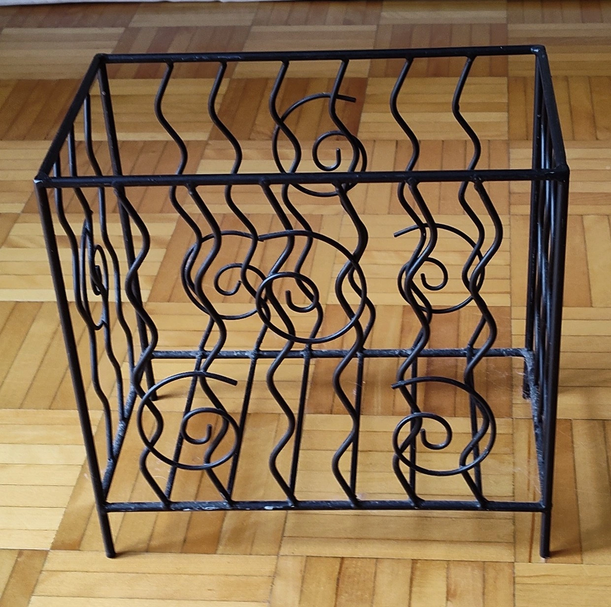 Selling a black metal magazine rack! It has a unique design with wavy and circular metal detailing. Great for adding a touch of vintage charm to your living room or office
