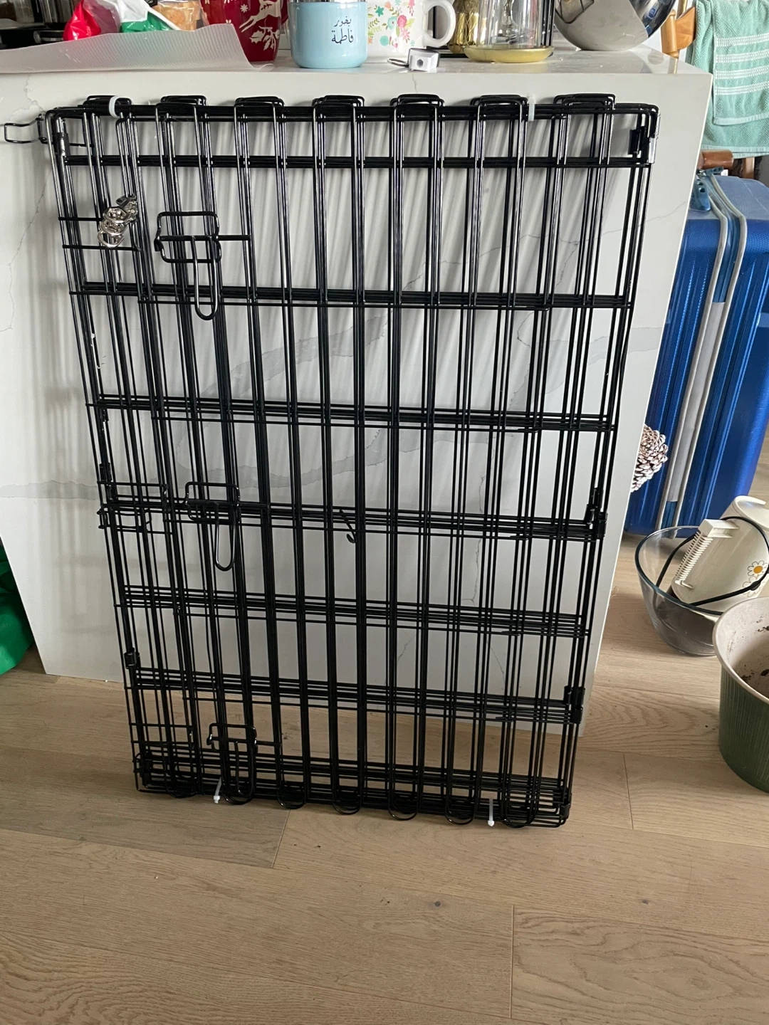 Selling a black metal pet exercise pen. It's in great shape and ready for a new home! Perfect for keeping your furry friend safe and secure, whether indoors or outdoors. It's a great way to give your pet some extra space to play and roam while keeping them contained 4 pieces, one piece has door 24x 36 inches each grill Cash only