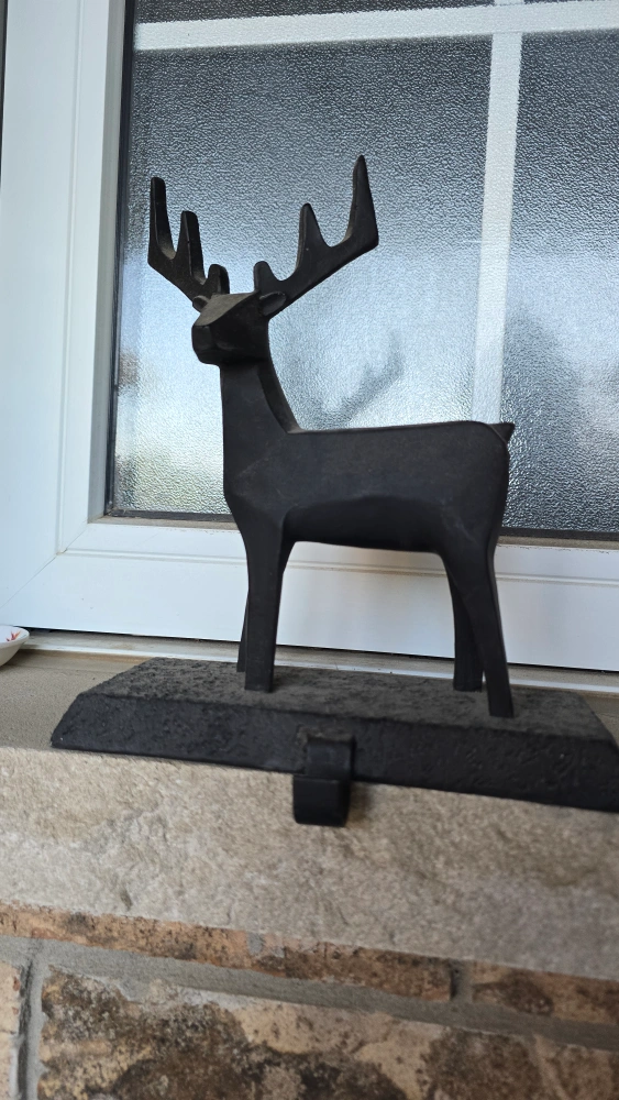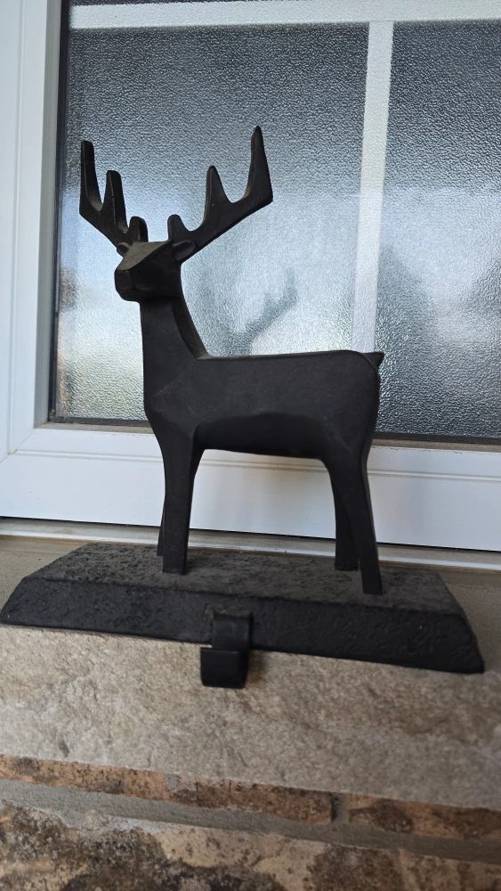 This is a black metal reindeer stocking holder. It's perfect for adding a rustic touch to your holiday decor and is in great condition great for christmas