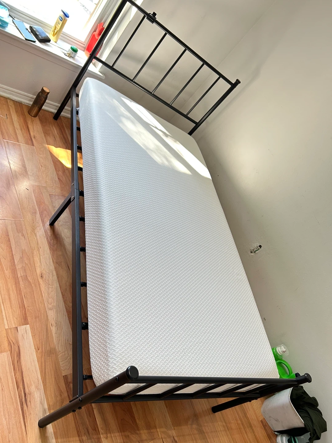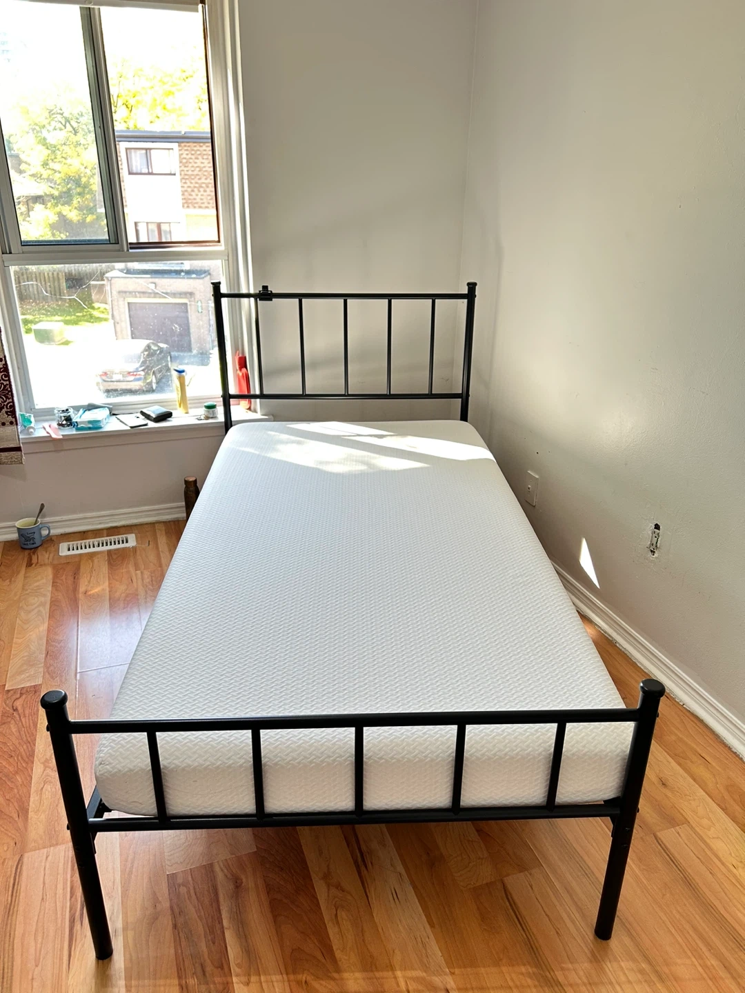 Twin Metal Bed Frame with Mattress – Excellent Condition Description: Selling a twin-size metal bed frame with matching twin mattress. Both are in almost new condition, used lightly and very well cared for. What’s Included: • Twin-size heavy-duty metal bed frame (no rust, very clean) • Twin mattress (used ~6 months, well cared for, no stains or sagging) • All hardware (screws, rails) + slats included • (Optional extras: mattress protector.