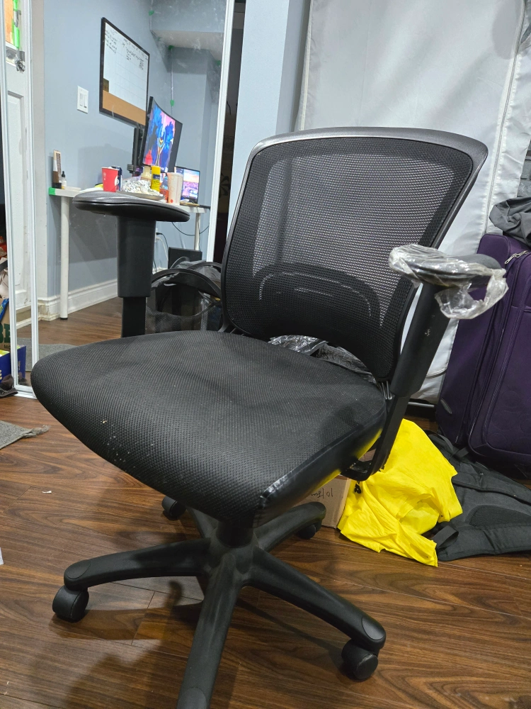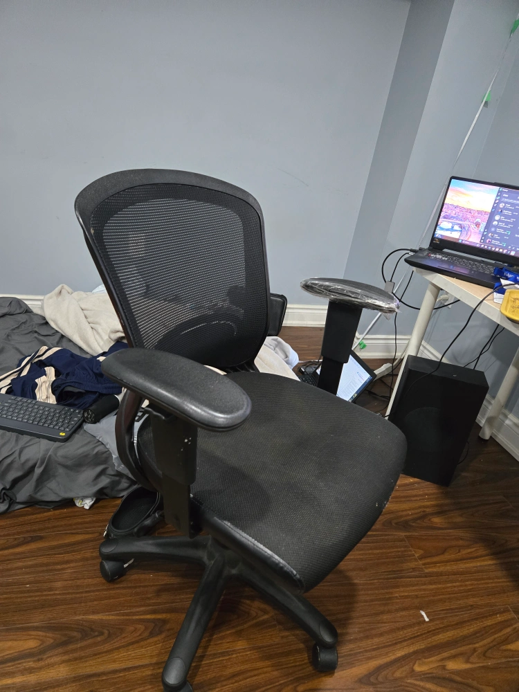 Selling a used black office chair. It's in good condition and ready for a new home office setup! The chair features a mesh back for breathability and adjustable armrests for added comfort. very comfortable perfect for those long sitting hours.