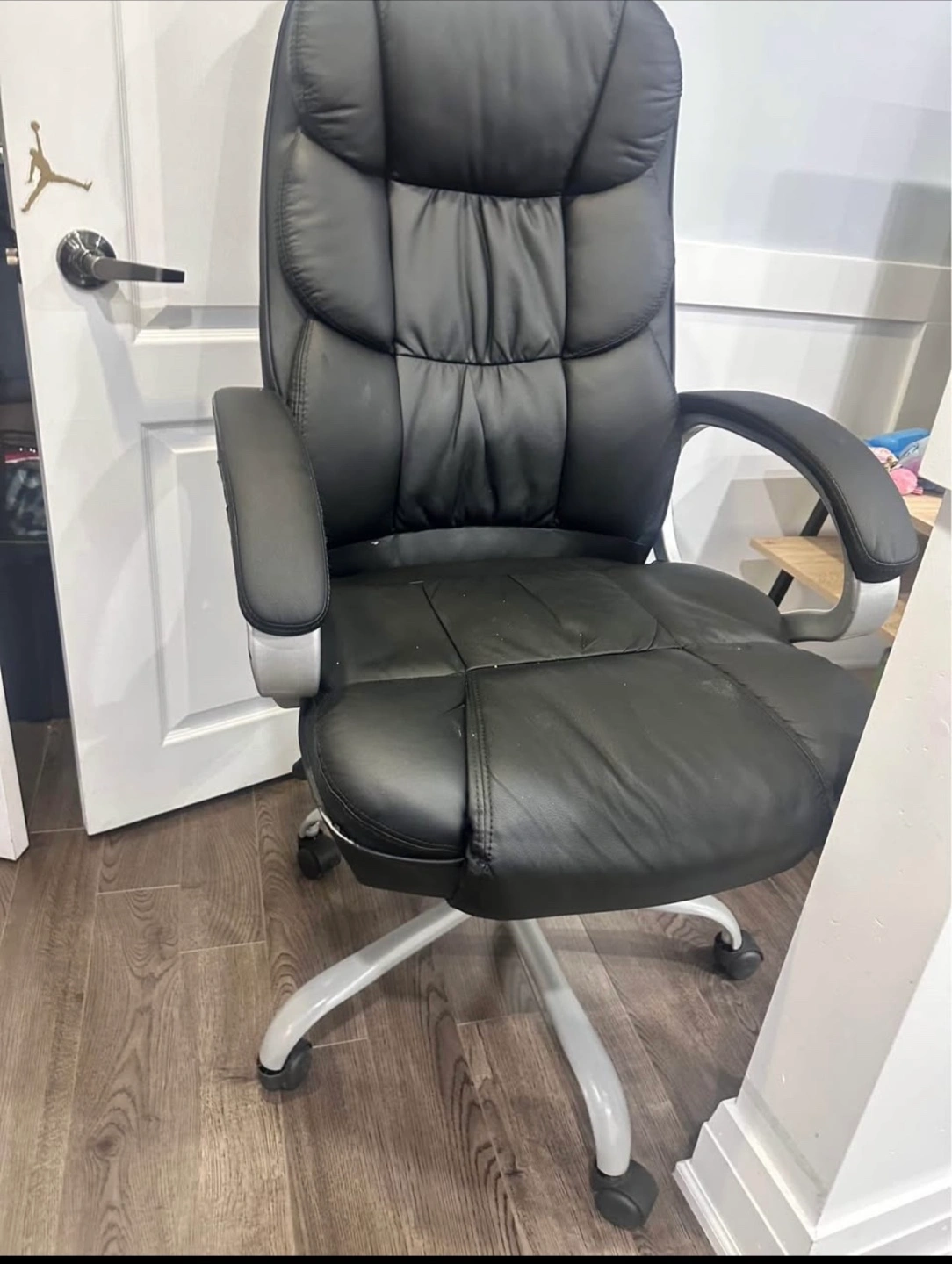 A black office chair, perfect for work from home. The chair has a high back with armrests and rolling wheels. It is upholstered in a dark material. It would be ideal for a moment of quiet reflection.