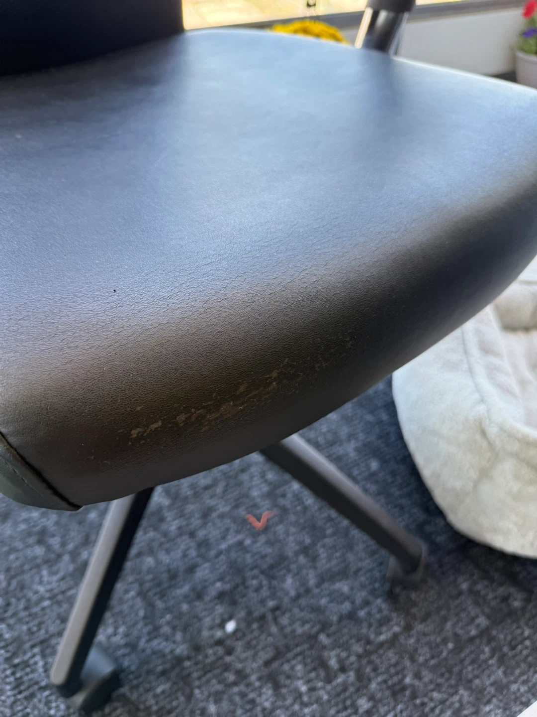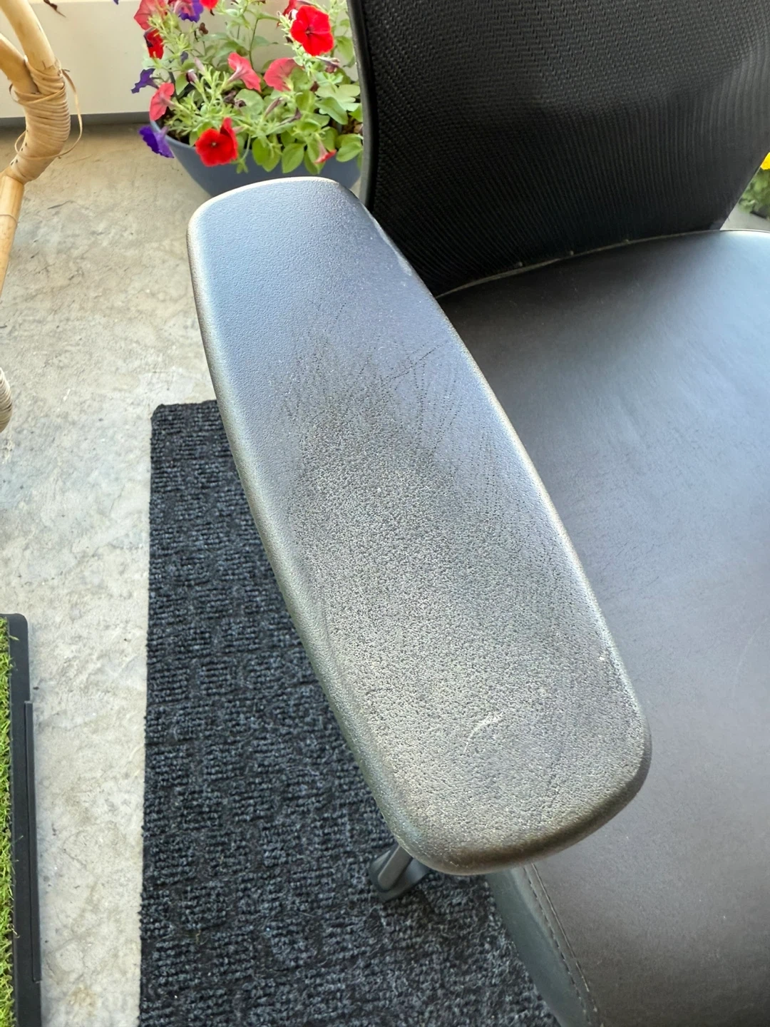 Selling a black office chair. It has a mesh back and a leather seat. There are some signs of wear on the seat and armrests, as shown in the pictures. Works perfectly