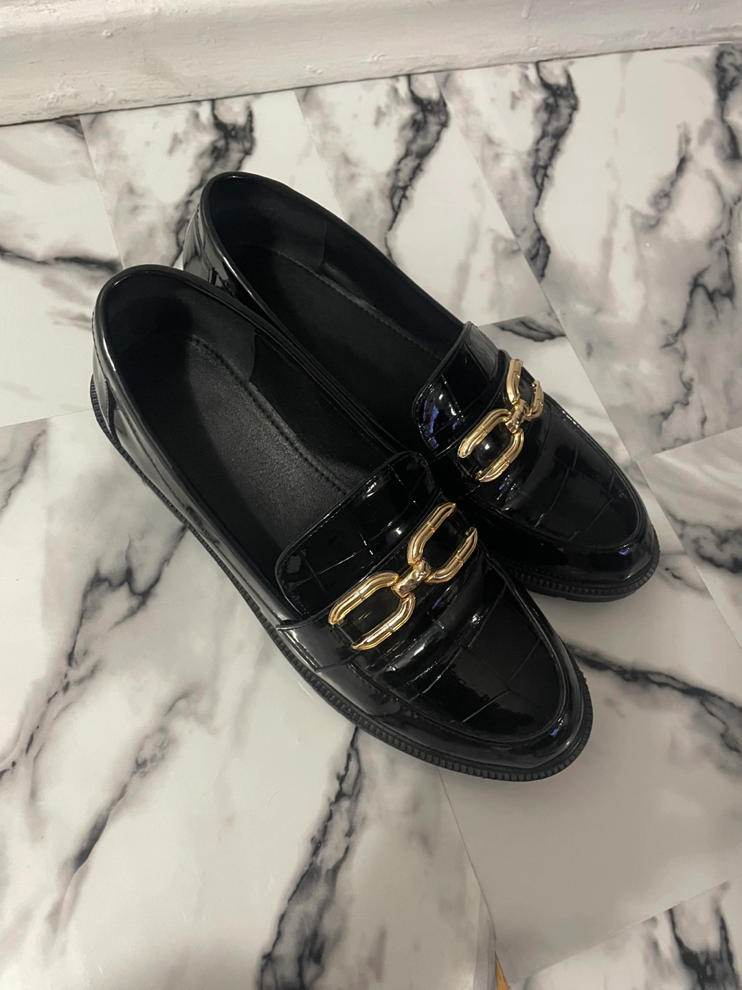These are a pair of stylish black patent leather loafers. They feature a chunky sole and a gold chain detail across the top. They're perfect for adding a touch of class to any outfit!