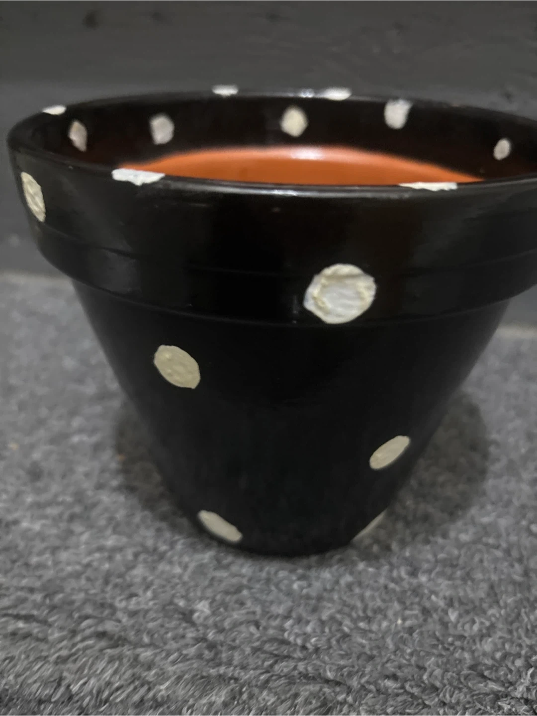 Cute little black pot with white polka dots! It's perfect for small plants or succulents to add a touch of fun to your space