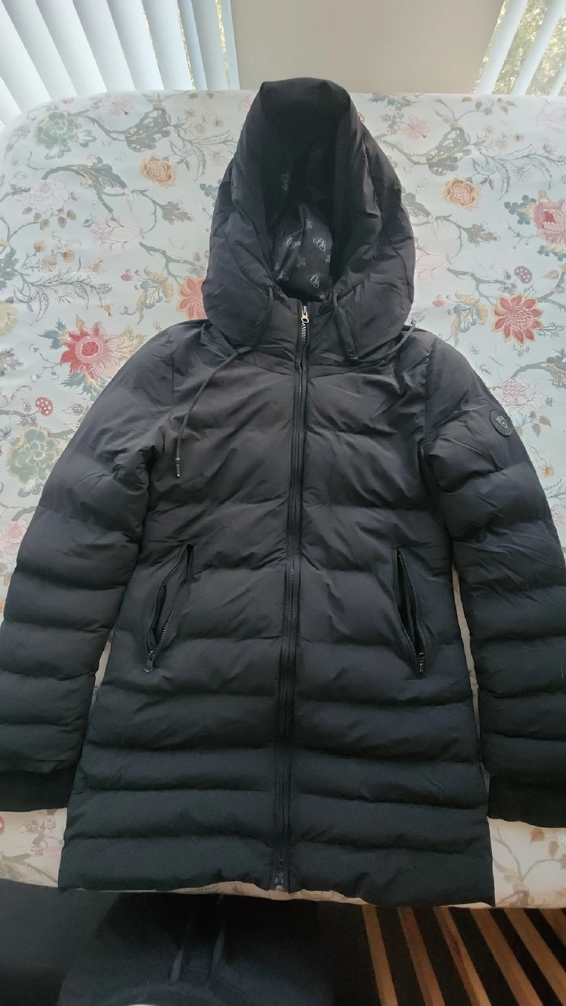 Selling a cozy black puffer jacket! It's in great condition and perfect for the chilly Canadian weather. It features a hood and zippered pockets to keep your belongings safe and dry. size small