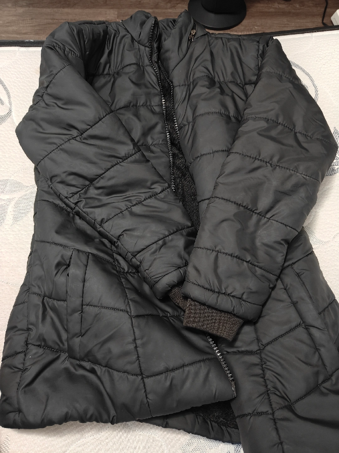 Selling a black puffer jacket. It's in great condition and ready for the colder weather. The jacket features a quilted design and a zipper closure. Perfect for staying warm and stylish during the fall and winter seasons