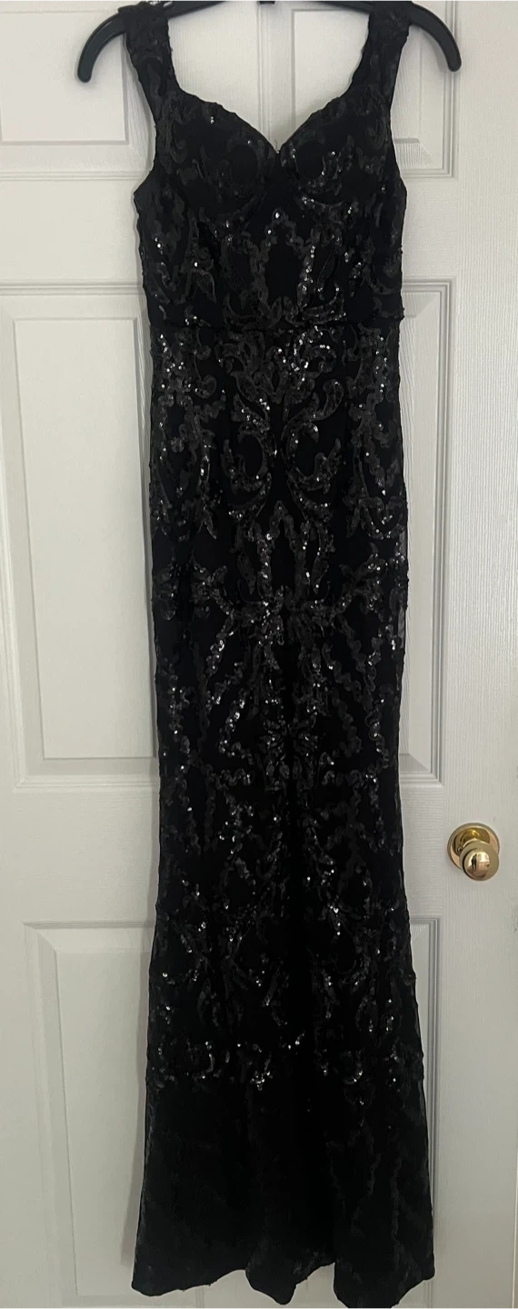 Selling a stunning black formal dress with sequin detailing. It's in great condition and perfect for a special occasion! The dress has a fitted silhouette and a beautiful design. It is a timeless piece that will make you feel elegant. Has zipper in the back. Size: Small