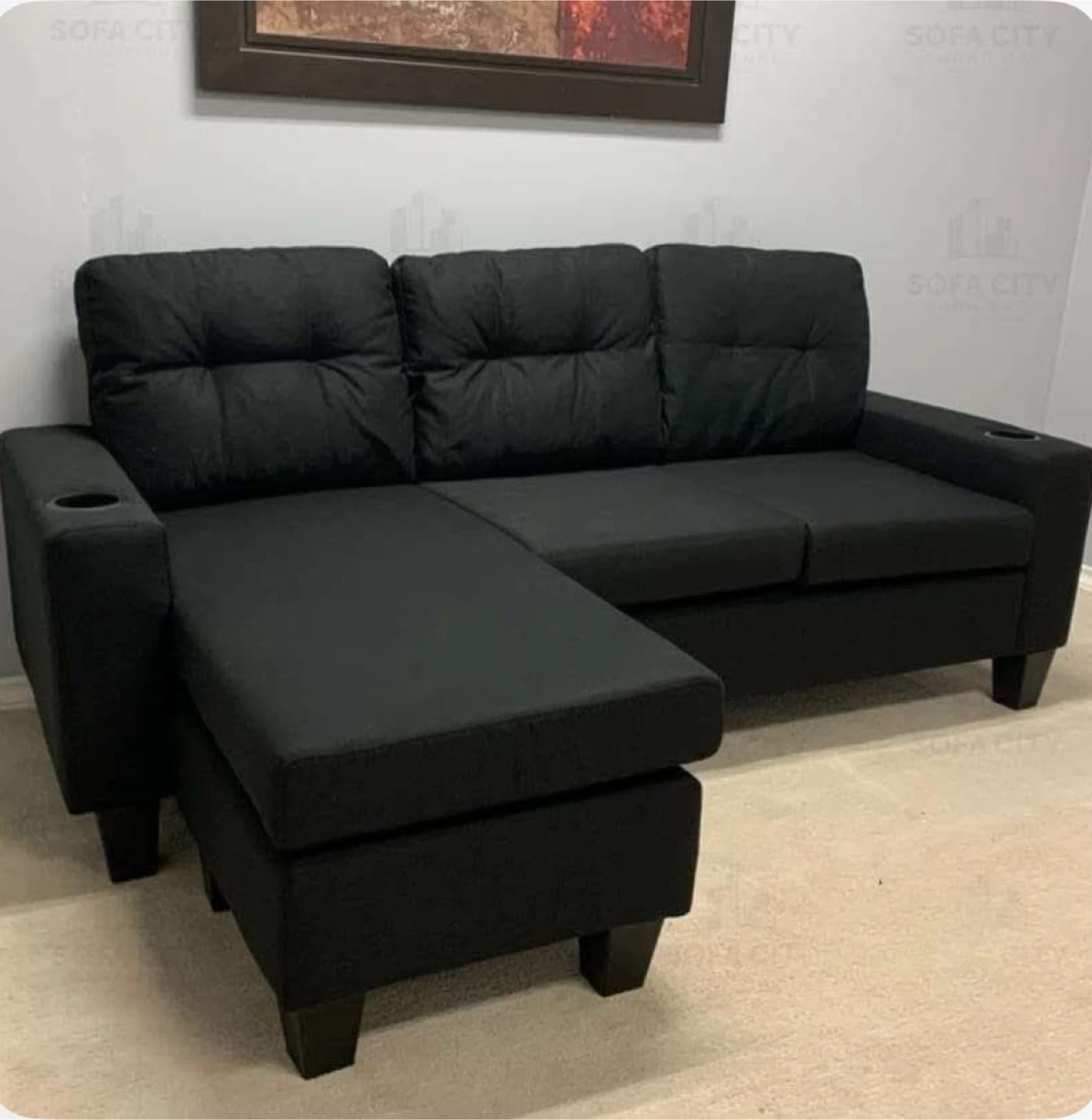 Selling a black sectional couch. Slightly used . No damage. It features a chaise lounge and built-in cup holders. Perfect for a living room or den!