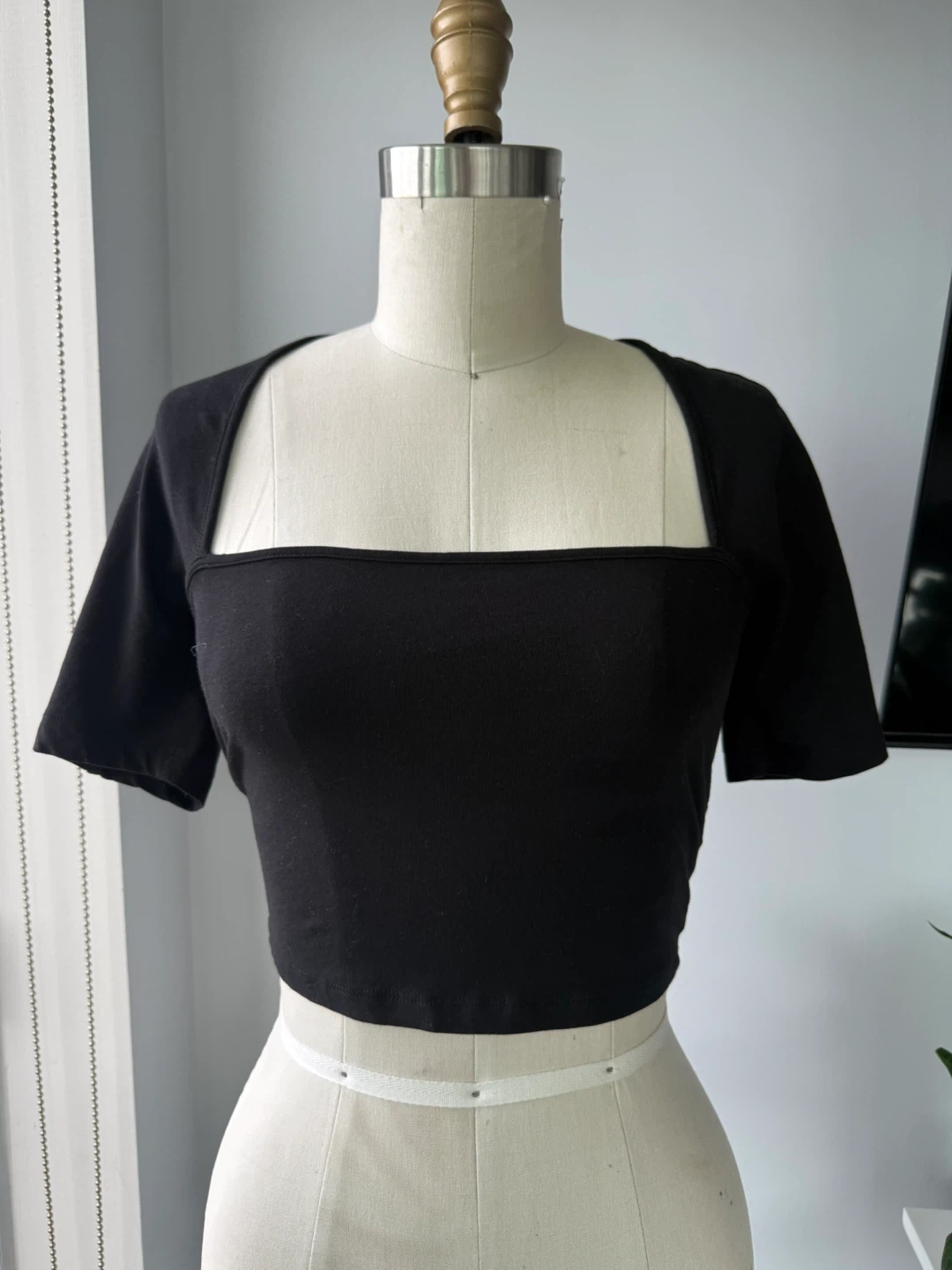 Selling a cute black crop top with a square neckline! It's in great condition and would look great with high-waisted jeans or a skirt. Perfect for a night out or a casual day. The material is soft and comfortable, making it a great addition to your wardrobe!