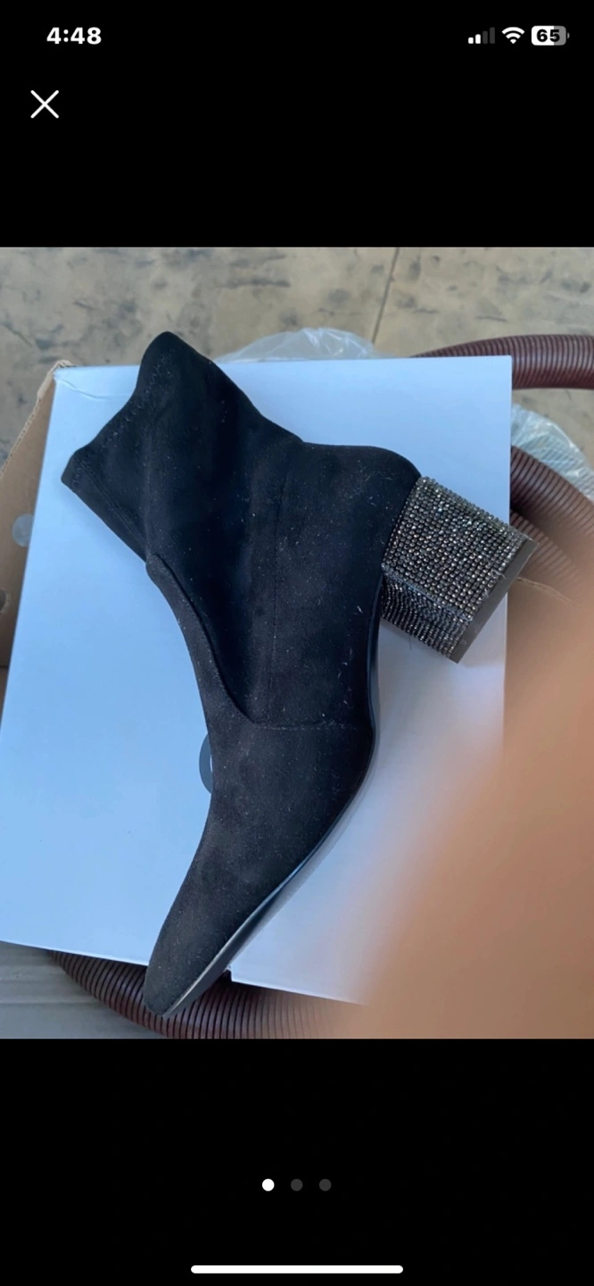 Women's black suede ankle boots. Block heel embellished with rhinestones. Zip closure. Looks great with jeans or a dress. Size 11 Pick up in the Jane and Church Streets Area. Cash only