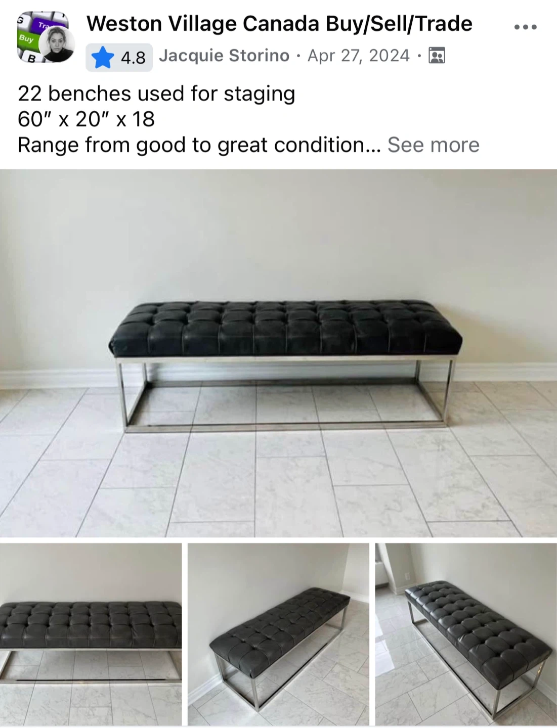 I have a black tufted bench available! It measures 60" x 20" x 18". It's been used for staging and is in good to great condition.