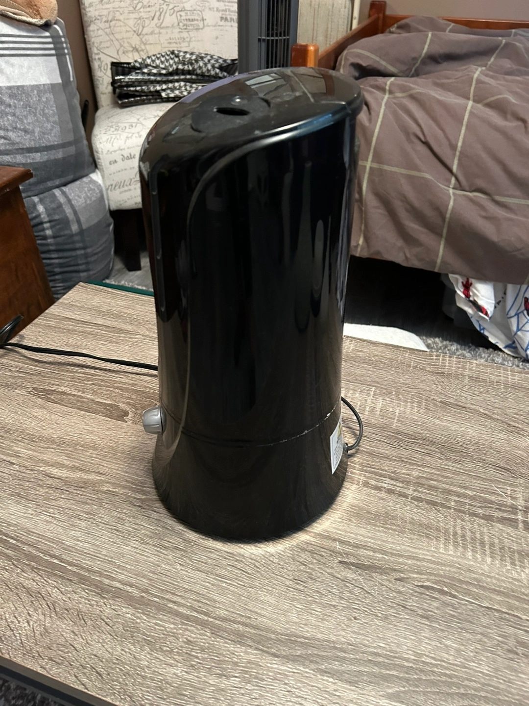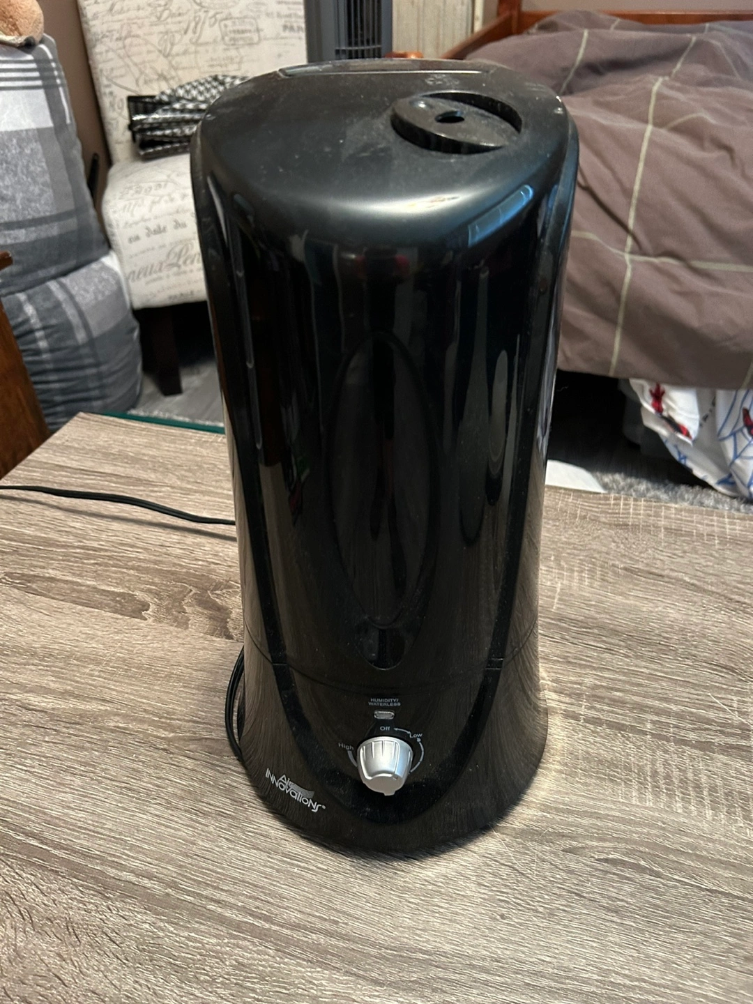 A sleek black cold air humidifier. Features a dial with settings. A cord and an opening on top. This humidifier can make your home feel more comfortable and relaxed.