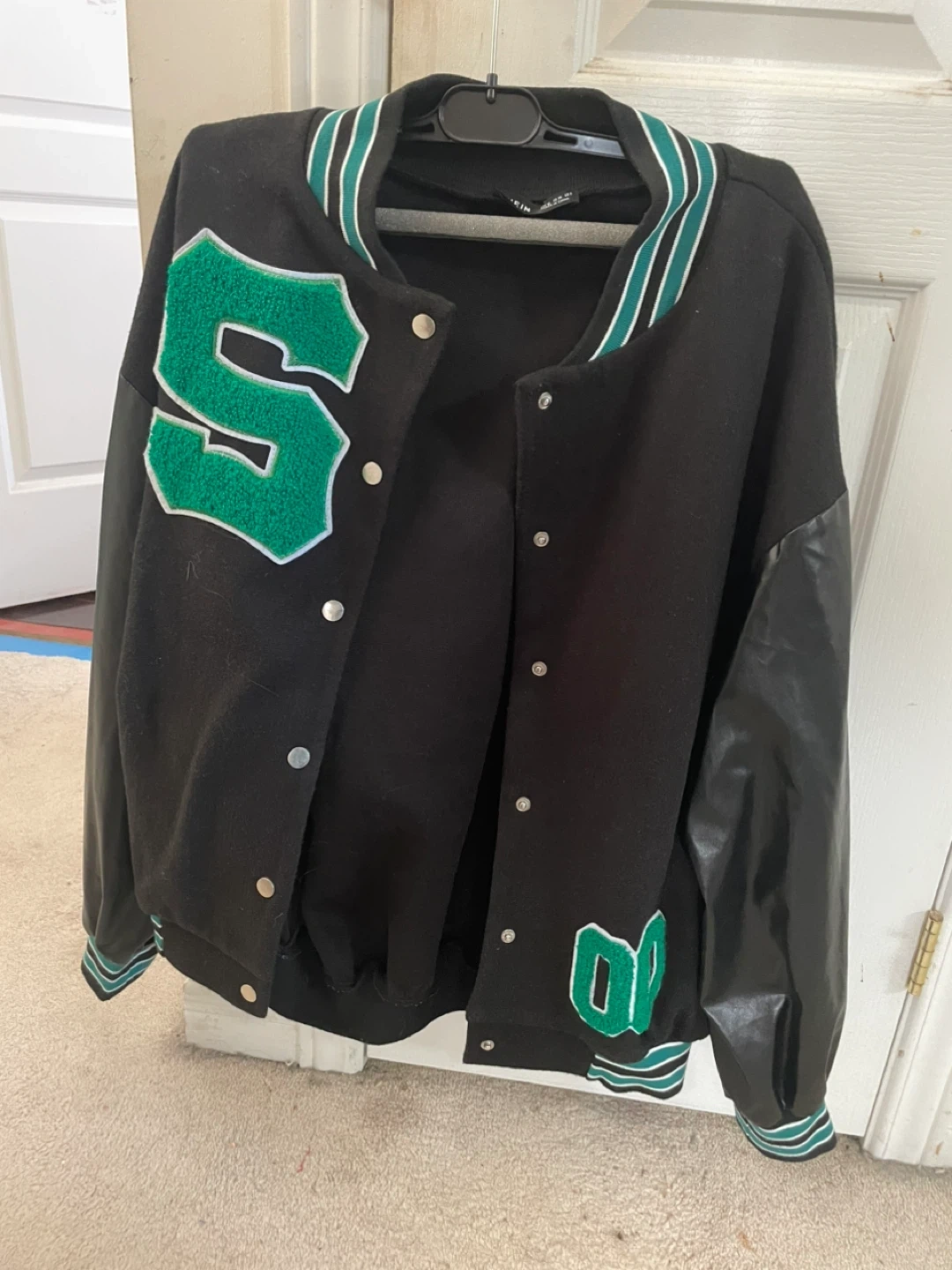 Selling a varsity jacket in black. It has a letter 'S' on the front, OO on bottom left and green and white striped detailing around the collar, cuffs, and hem. The sleeves appear to be made of a faux leather material. Will fit size medium. Sfpfh. Ajax. Rossland and Salem area.