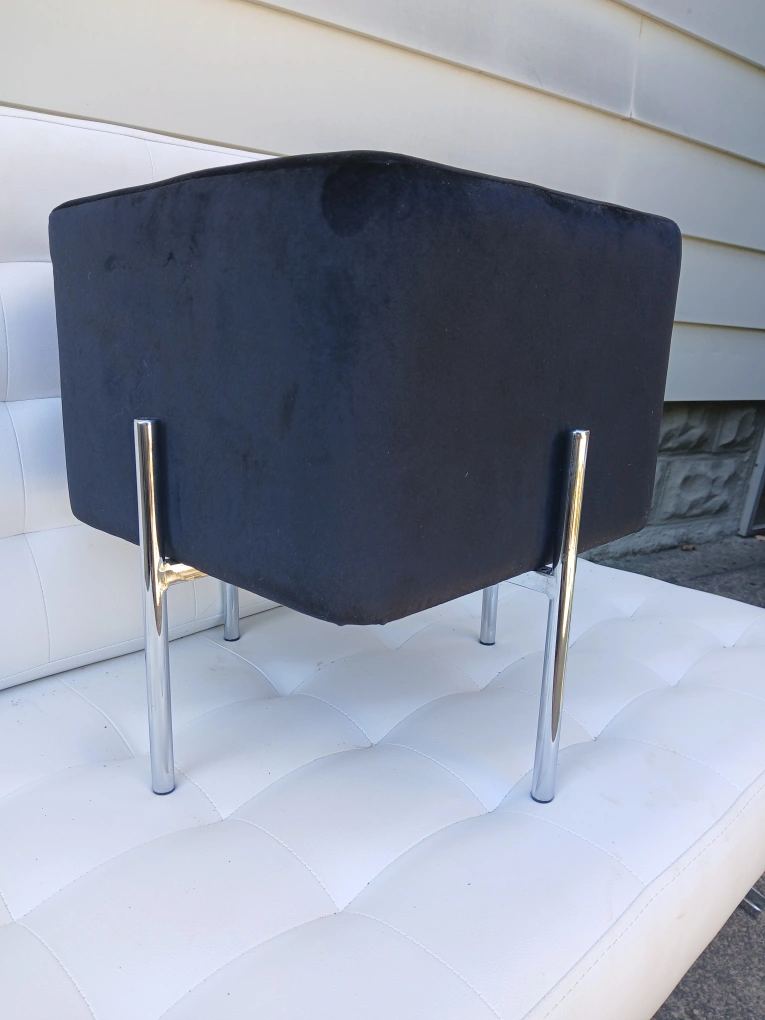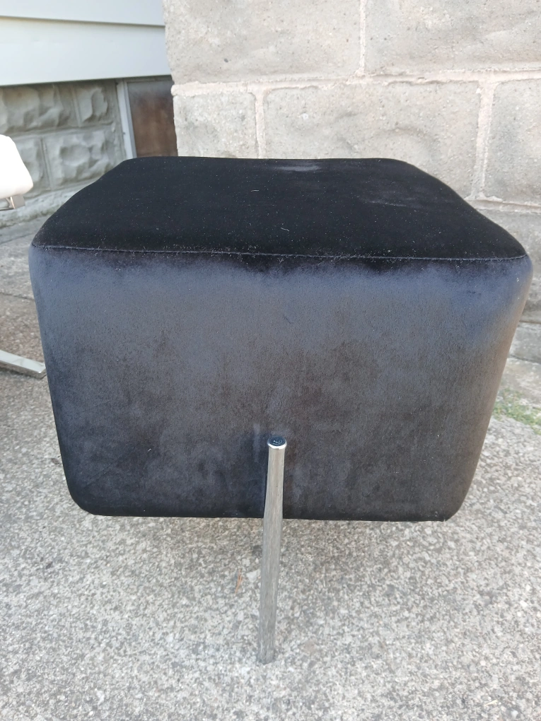 Selling a stylish pair of black velvet ottomans. It has a square shape and sleek chrome legs. These ottomans would be a great addition to any living space! Used for staging only. Price is for the pair