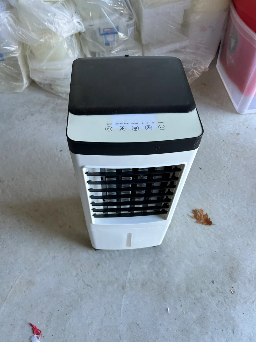 Selling a portable air cooler with a black and white design. It features multiple settings including low, mid, high, and cooler. There are also timer options for 1, 2, and 4 hours, as well as a swing function