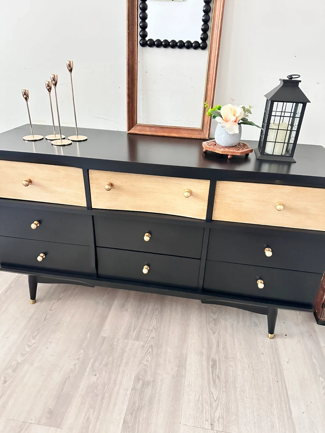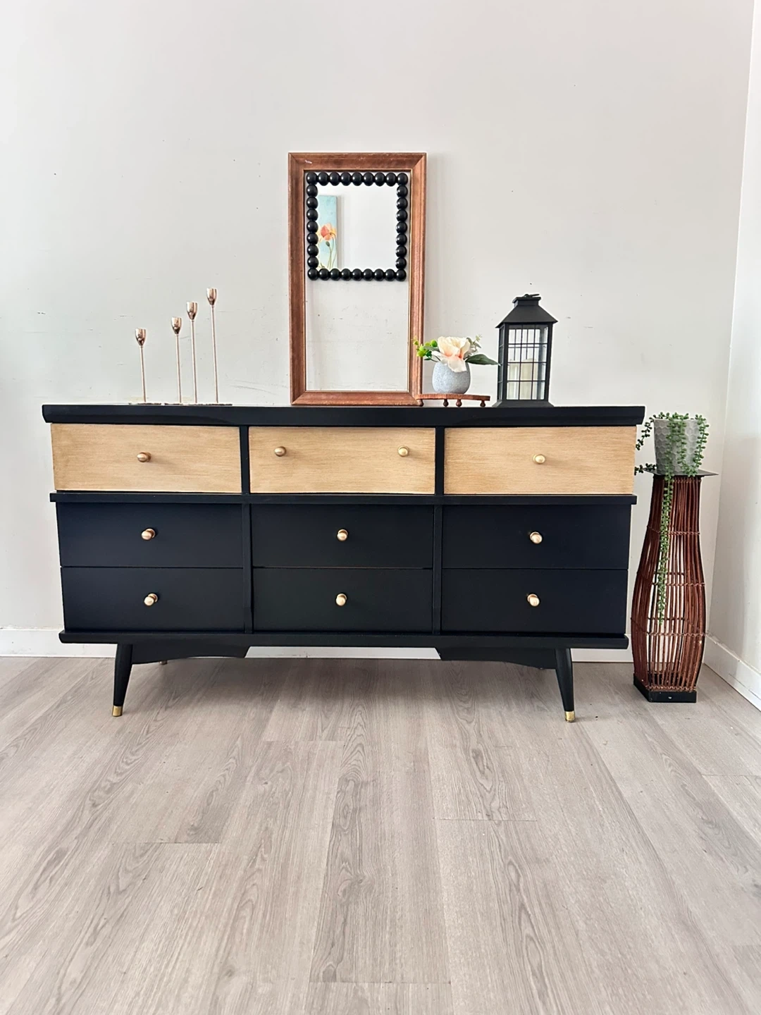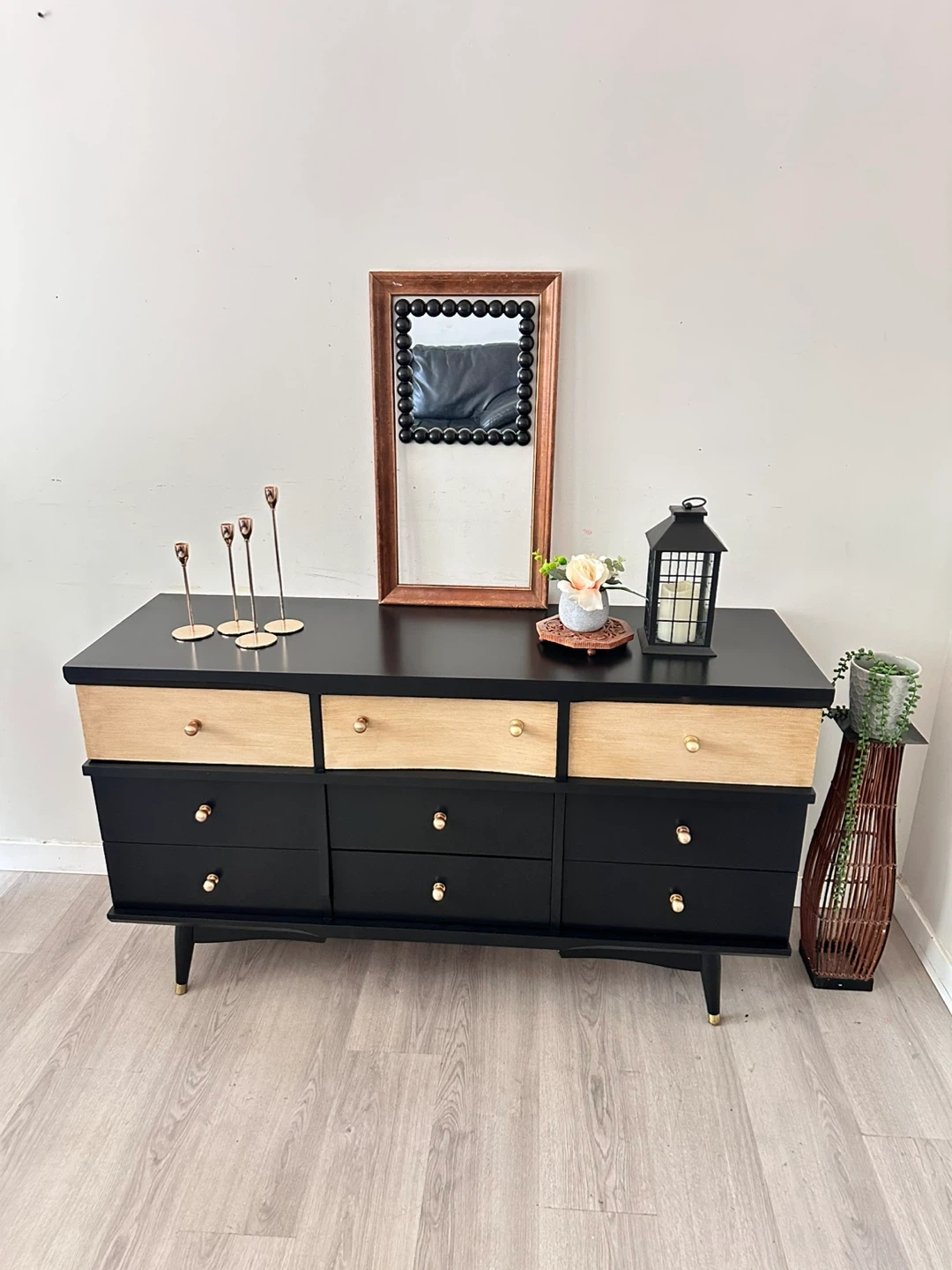 Selling a dresser with a unique two-tone design! The top drawers are a lovely light wood, and the bottom section is painted black. It's a stylish piece that would look great in any bedroom or living space L 55” x D 17.5” x H 31”