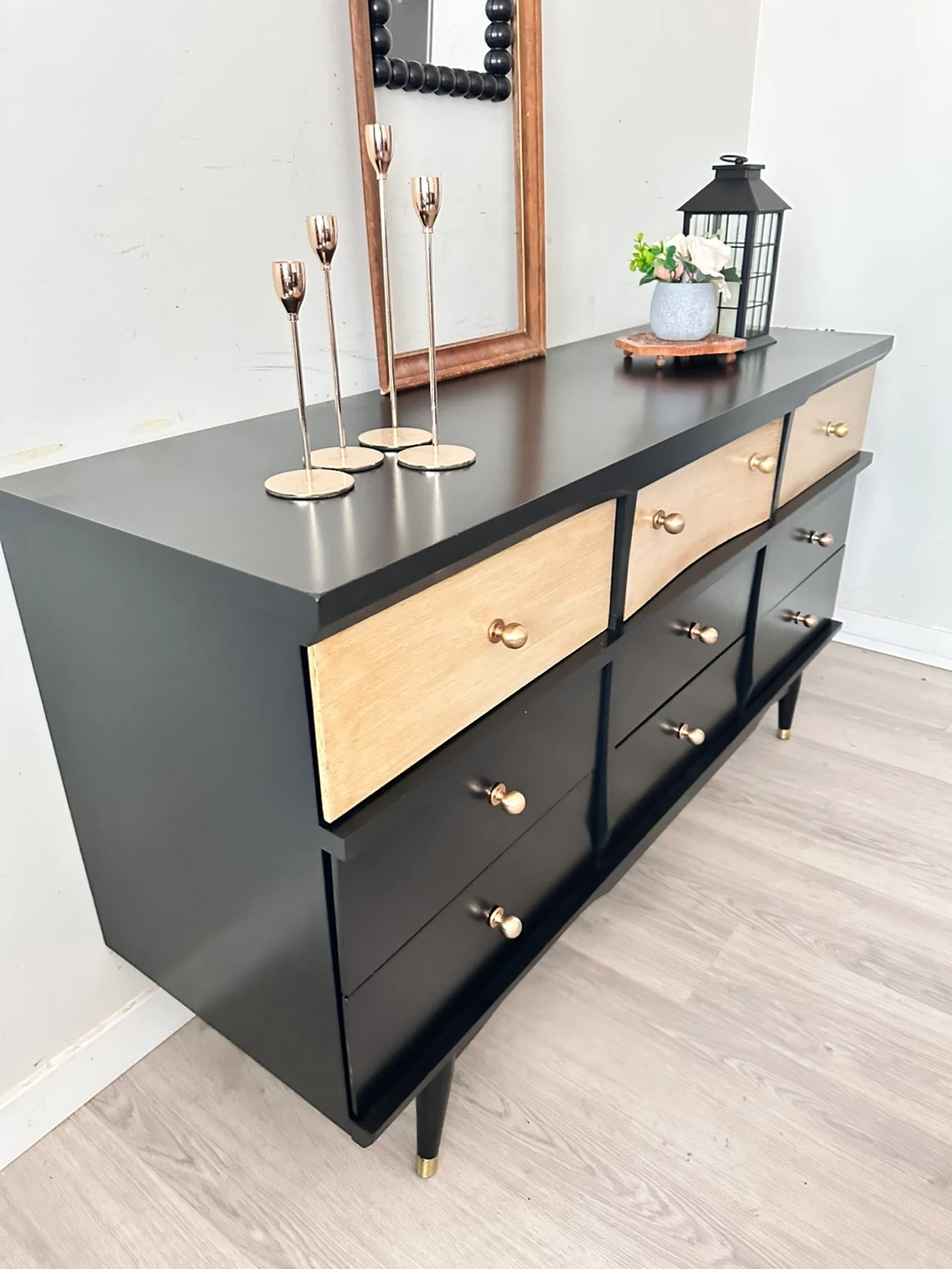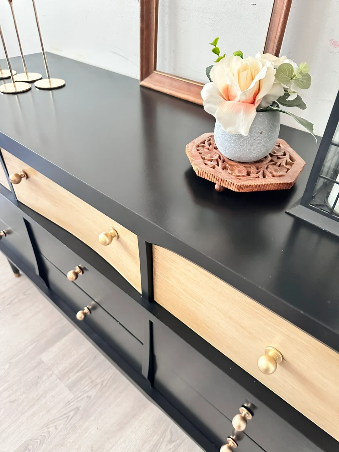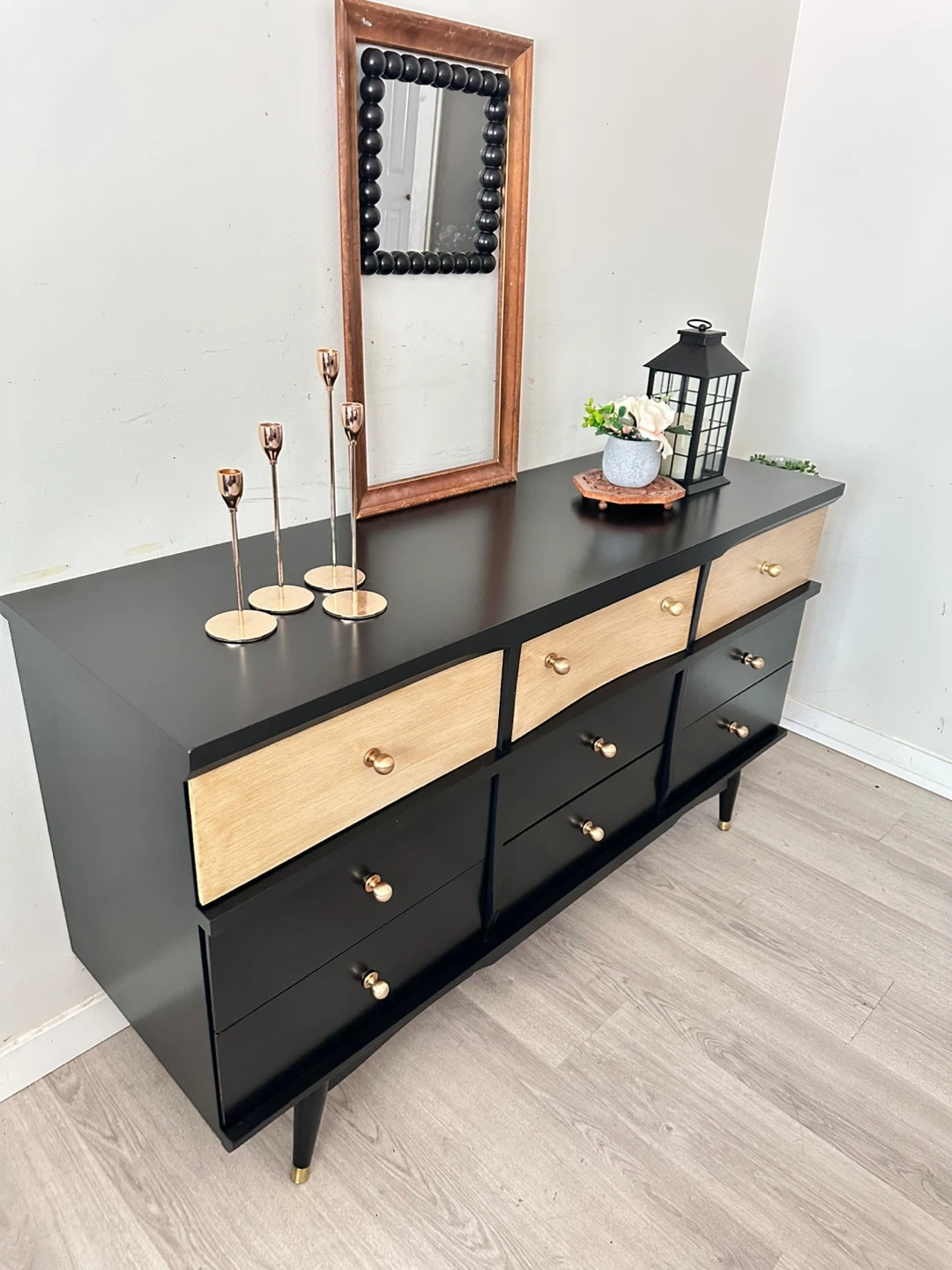 Selling a dresser with a unique two-tone design! The top drawers are a lovely light wood, and the bottom section is painted black. It's a stylish piece that would look great in any bedroom or living space L 55” x D 17.5” x H 31”