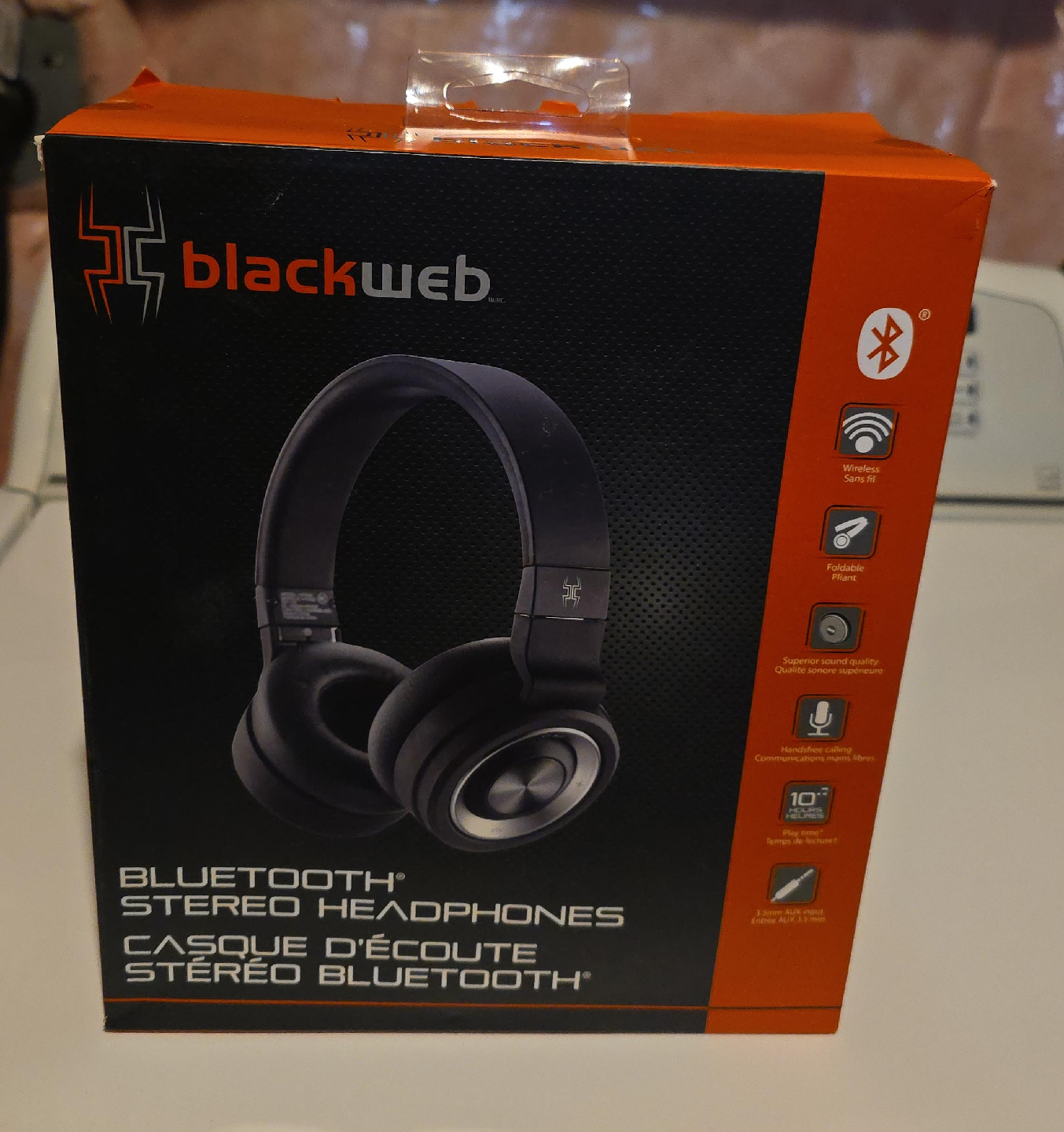 Selling a brand new pair of Blackweb Bluetooth Stereo Headphones, still sealed in the box! These headphones feature wireless connectivity, a foldable design, and superior sound quality. Perfect for hands-free calling and enjoying up to 10 hours of playtime. They also have a 3.5mm AUX input.