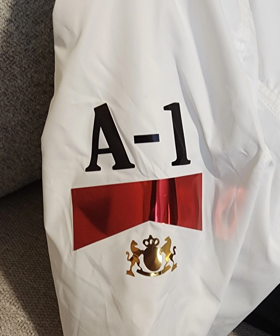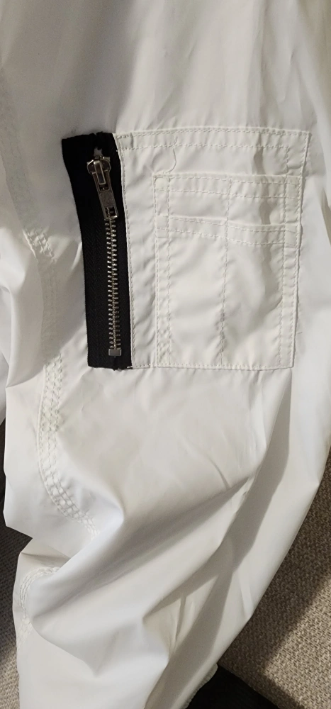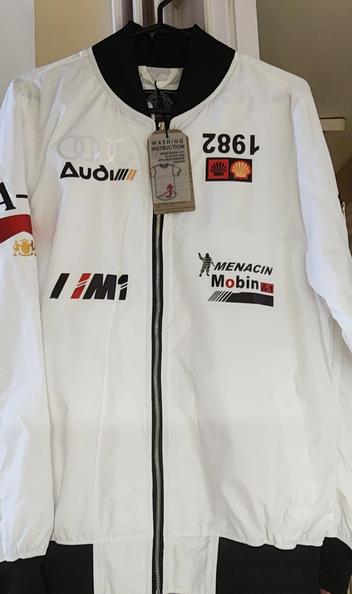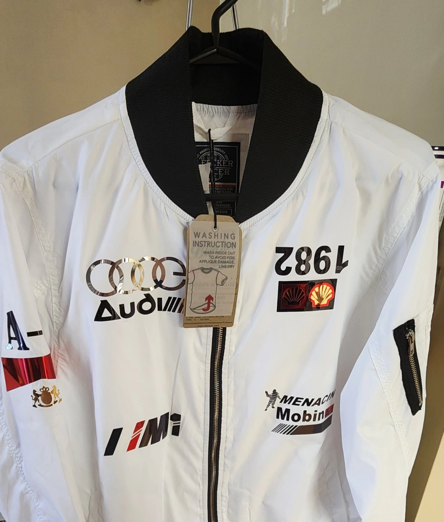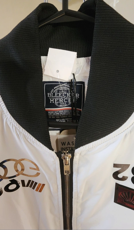 Here's a Bleecker & Mercer racing jacket! It's white with black accents and lots of cool racing-themed designs. Perfect for adding a bit of sporty style to your wardrobe. Flashy A-1 embellishment on one sleeve and zippler with multiple pockets on the other. Great for a car enthusiast!