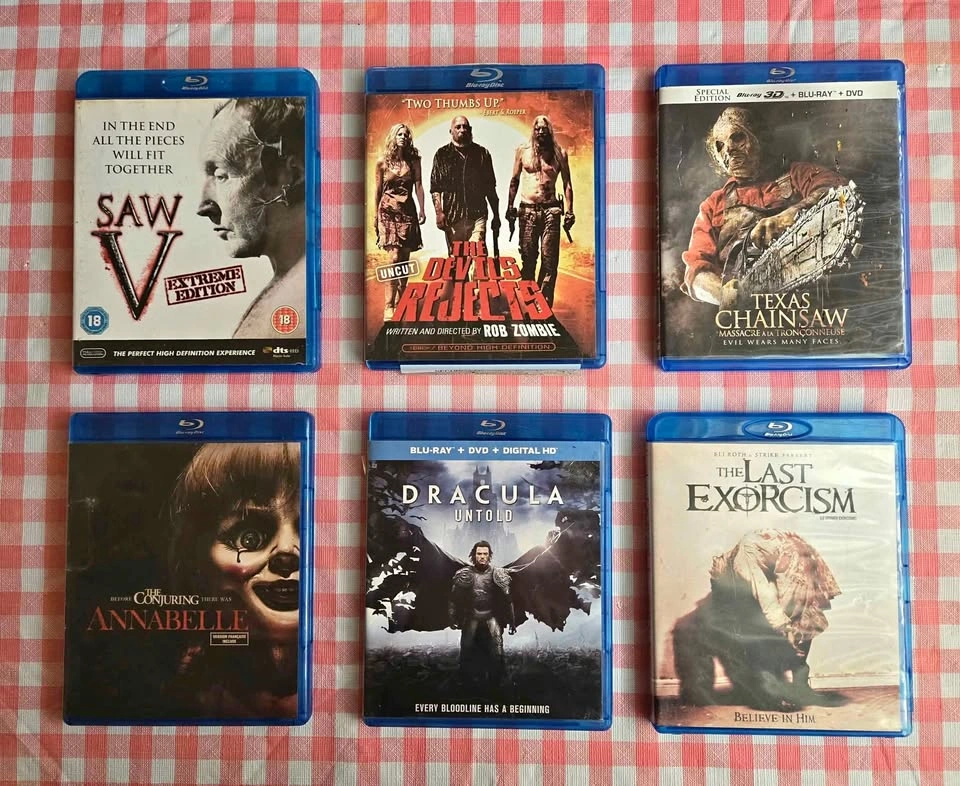 Blu-ray Horror Genre Movies: 1. Saw V - Horror-Thriller/Slasher: 2008. 2. The Devil's Rejects Uncut - American Horror: 2005 Directed by Rob Zombie. 3. Texas Chainsaw 3D: Horror/Slasher: 2005 (Blu-ray disk only.) 4. Annabelle - Supernatural Horror: 2014 5. Dracula Untold - Dark Fantasy Action-Horror: 2014 6. The Last Exorcism: Supernatural Horror: 2010 All 6 movies are gently used, intact. All disks are in mint condition with no scratches. $4 each / 3 for $10 / All 6 for $18 No holds. Cash is preferable. Exact payment Only (No change) EMTs welcome. PICKUP Only, Weston area. Comes from a clean, bug free, smoke free, kitty friendly home. Willing to meet curbside. Pls check out my other Blu-ray listings. Stay tuned for more posting...