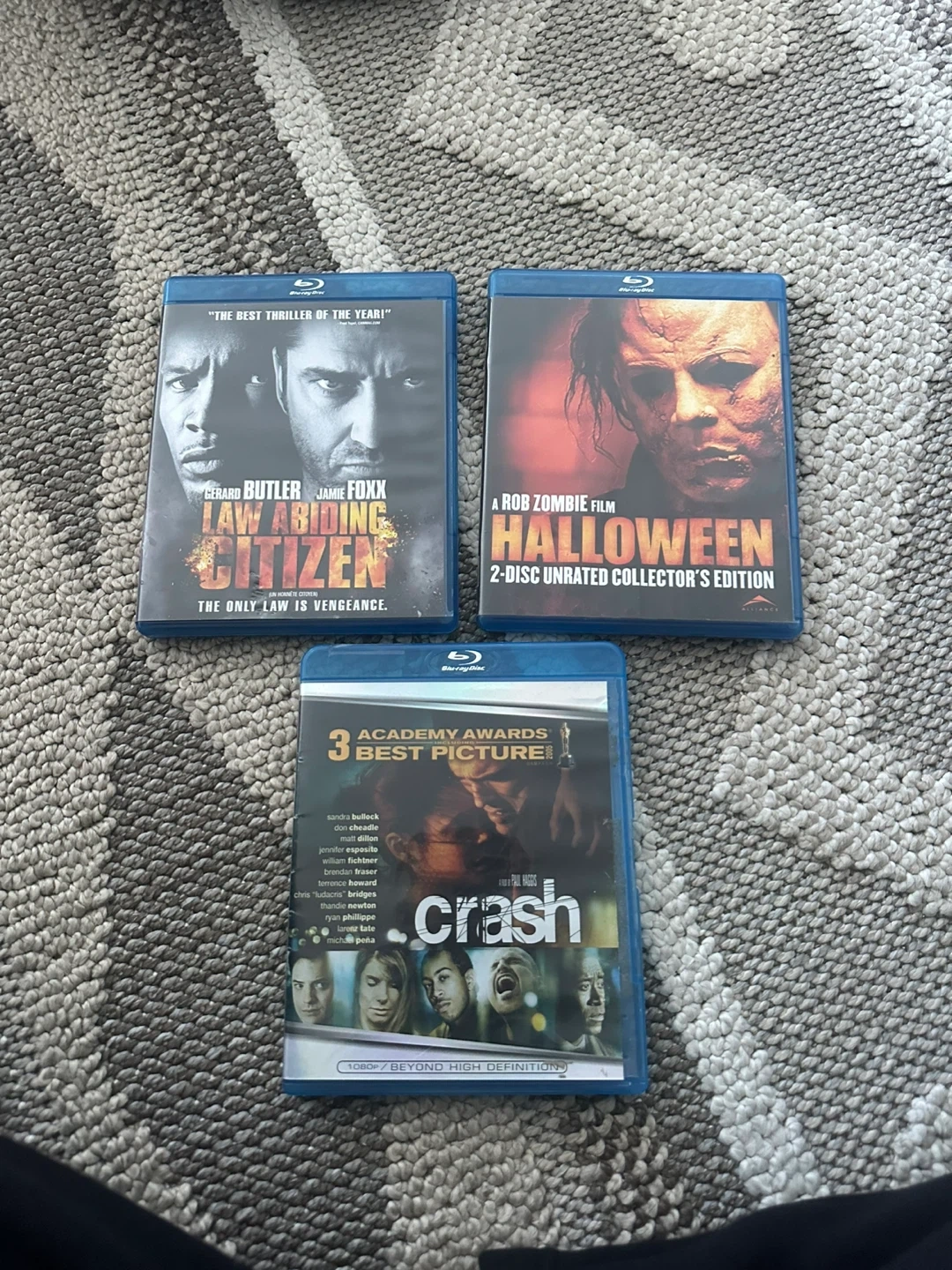Selling a bundle of Blu-ray movies! Includes: - Law Abiding Citizen starring Gerard Butler and Jamie Foxx - Halloween (Rob Zombie film, 2-Disc Unrated Collector's Edition) - Crash, winner of 3 Academy Awards for Best Picture All for $10 Pick up Islington & Queensway