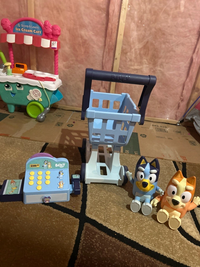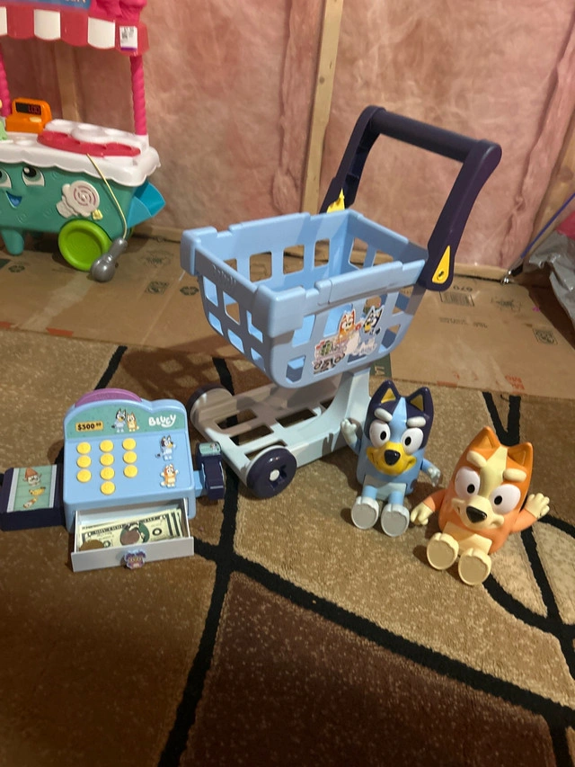This used Bluey and Bingo shopping cart set is perfect for your little one's imaginative play! It includes a shopping cart, a toy cash register, and Bluey and Bingo figurines to bring the adventures of Bluey to life. The set is in good condition and ready for a new home. Here are some additional details: * Includes Bluey and Bingo figurines * Features a toy cash register with play money * The shopping cart is easy to maneuver This set is priced at $30. If the ad is up, it's available!