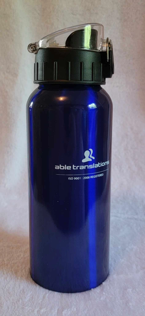 This Blue and White Able Translations Water Bottle is Brand and never used. Comes with Original Box. Made of Plastic. Box Damaged due to Storage. Measurements: Height: 8 1/4 inches. Diameter: 2 3/4 inches. From a smoke free home. Cash and E-Transfer accepted. Pick up only.